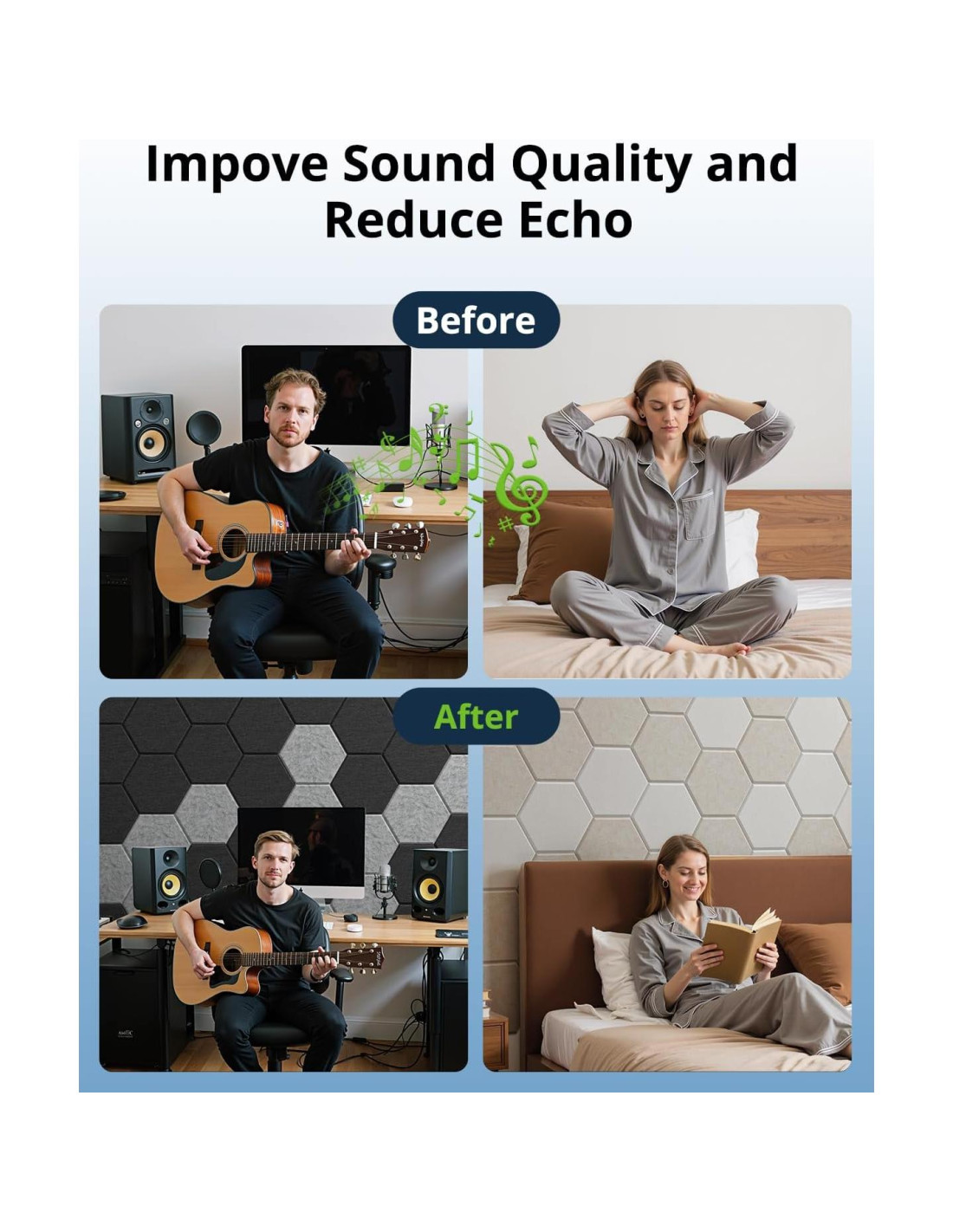 - RENDIMIENTO ACÚSTICO MEJORADO: ¡Di adiós a los ecos y reverberaciones no deseadas! Cada panel acústico está cortado con precisión de paneles de poliéster de alta densidad, 4.4lb/ft3 (70.4kg/m3). Nuestros paneles de amortiguación de sonido/paneles acústicos absorbentes de sonido están diseñados específicamente para reducir eficazmente el ruido y mejorar la acústica en cualquier entorno.
