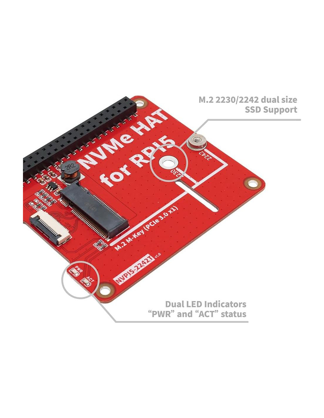 - Kit de Accesorios Completo Incluido: 1x NVPI5-2280B/2x cable FFC PCle (longitud 30mm)/2x cable FFC PCle (longitud 60mm)/4x espaciadores M2.5x14mm F/F/4x espaciadores M2.5x6+6mm F/M/5x tornillos M2.5x5mm/2x tornillos M2x4mm/1x conector HAT macho-hembra de 40 pines.