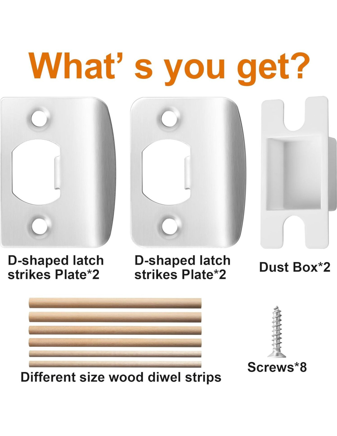 - El paquete incluye: Recibirá 4 juegos de kits de reparación de placas de strike para puerta, incluyendo 4 placas de strike con 8 tornillos, 4 cajas de polvo y 6 diferentes tamaños de tiras de dowel de madera para rellenar agujeros de tornillos viejos, suficiente para satisfacer sus necesidades diarias.