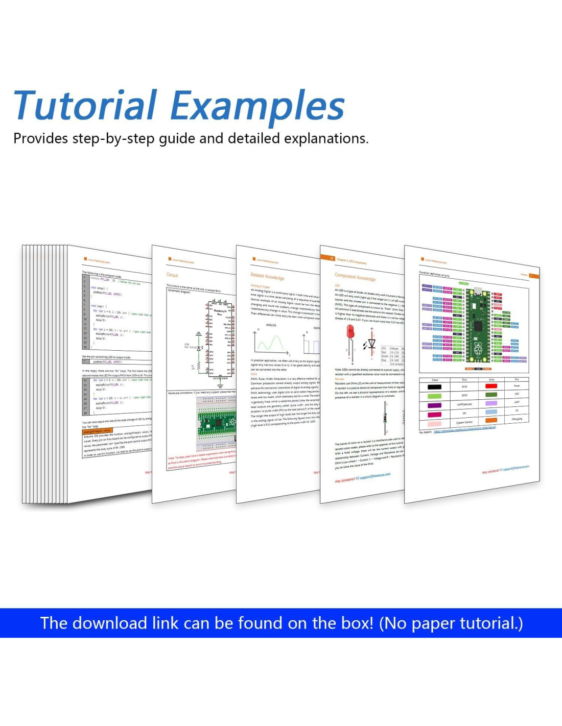 - Tutorial detallado: Proporciona una guía paso a paso con código en MicroPython, C y Processing (Java) (El enlace de descarga se puede encontrar en la caja del producto) (No hay tutorial en papel)