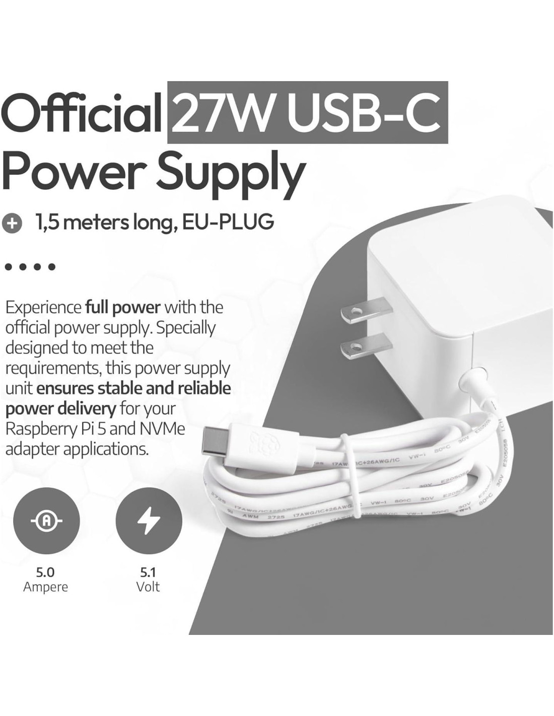 - Adaptador de corriente USB-C oficial de 27W: Estabilidad y seguridad en el suministro de energía para Raspberry Pi y periféricos.