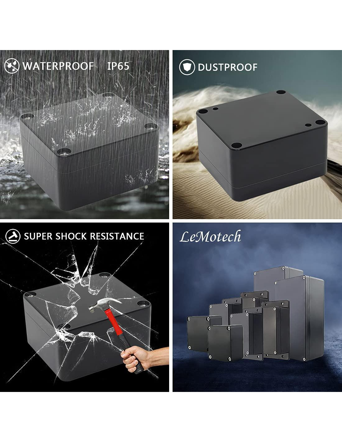 - IP65 a Prueba de Agua: La caja de proyecto LeMotech está diseñada para proporcionar protección contra la humedad, el agua y el polvo. Equipado con un sello de grommet de goma que sella herméticamente para asegurar que los componentes eléctricos estén secos y sean efectivos en ambientes húmedos o difíciles.