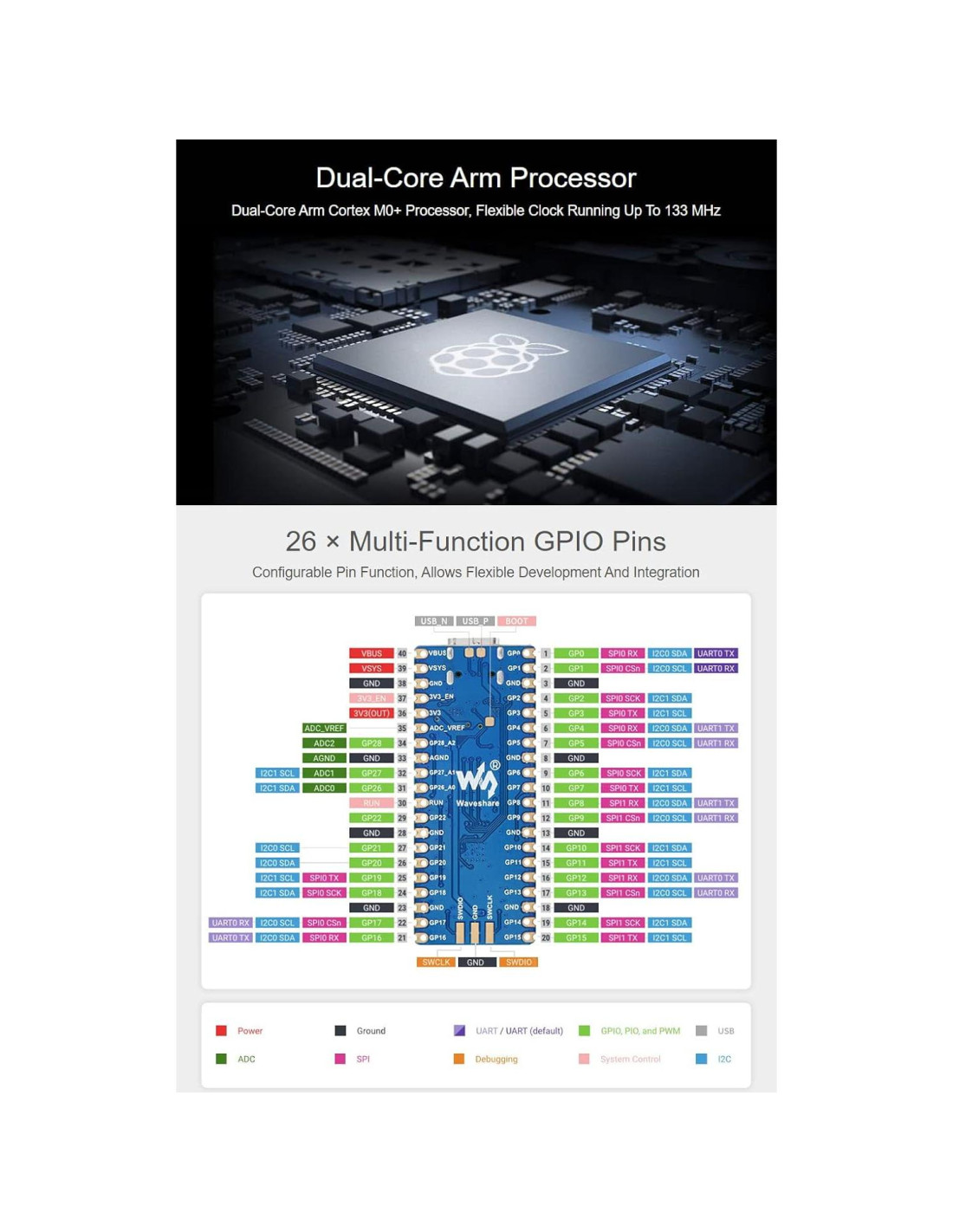 - Modos de bajo consumo y de reposo. Programación por arrastrar y soltar usando almacenamiento masivo a través de USB. 26 * pines GPIO multifuncionales. 2 * SPI, 2 * I2C, 2 * UART, 3 * ADC de 12 bits, 16 * canales PWM controlables
