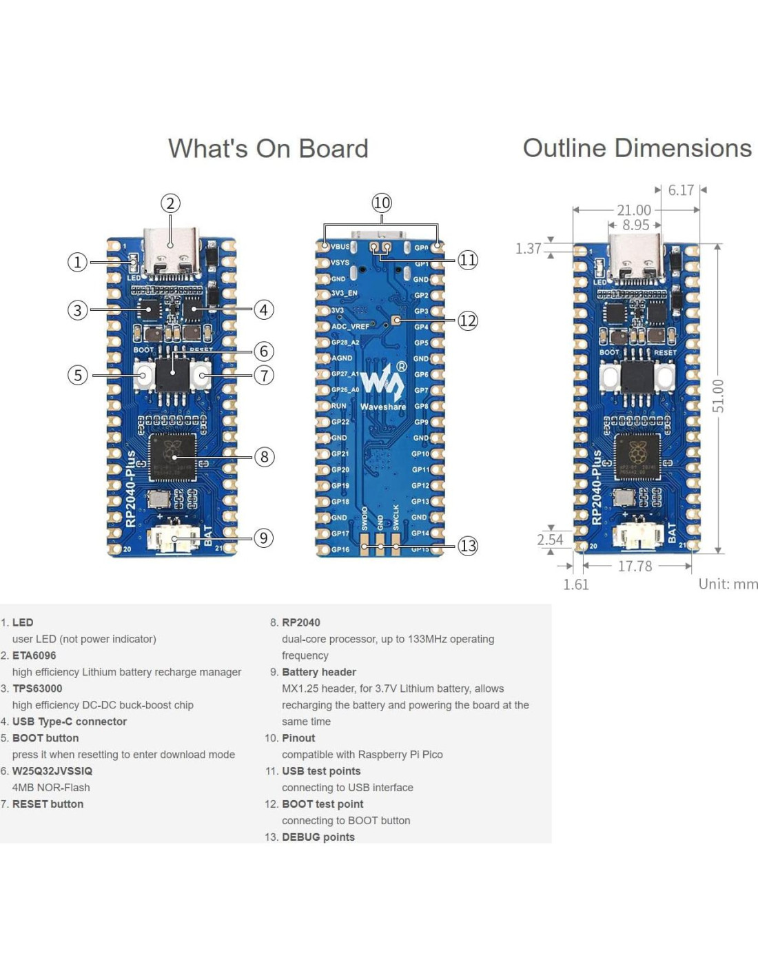 - 264KB de SRAM y 4MB de memoria Flash a bordo. Conector USB-C, lo mantiene actualizado, más fácil de usar. Conector de recarga/descarga de batería de litio, adecuado para dispositivos móviles