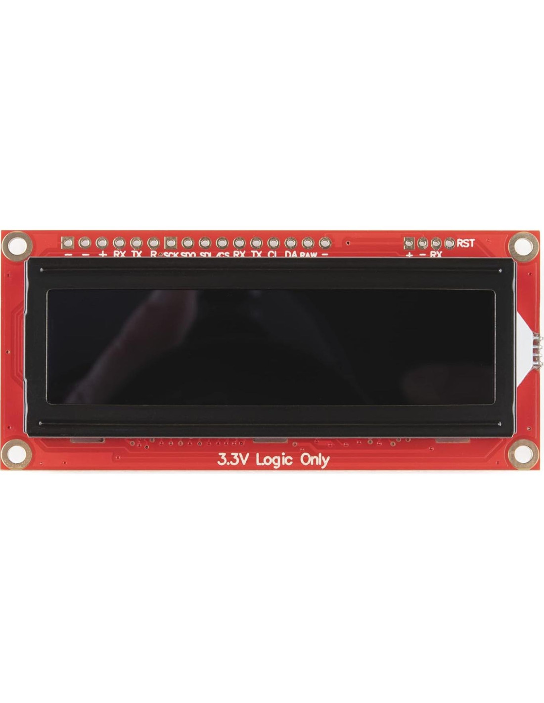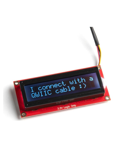 - 16x2, Pantalla RGB en Negro. Tres opciones de comunicación: Serie, I2C y SPI. Dirección I2C ajustable controlada a través de comandos especiales de software (0x72 por defecto). Conexión Qwiic.