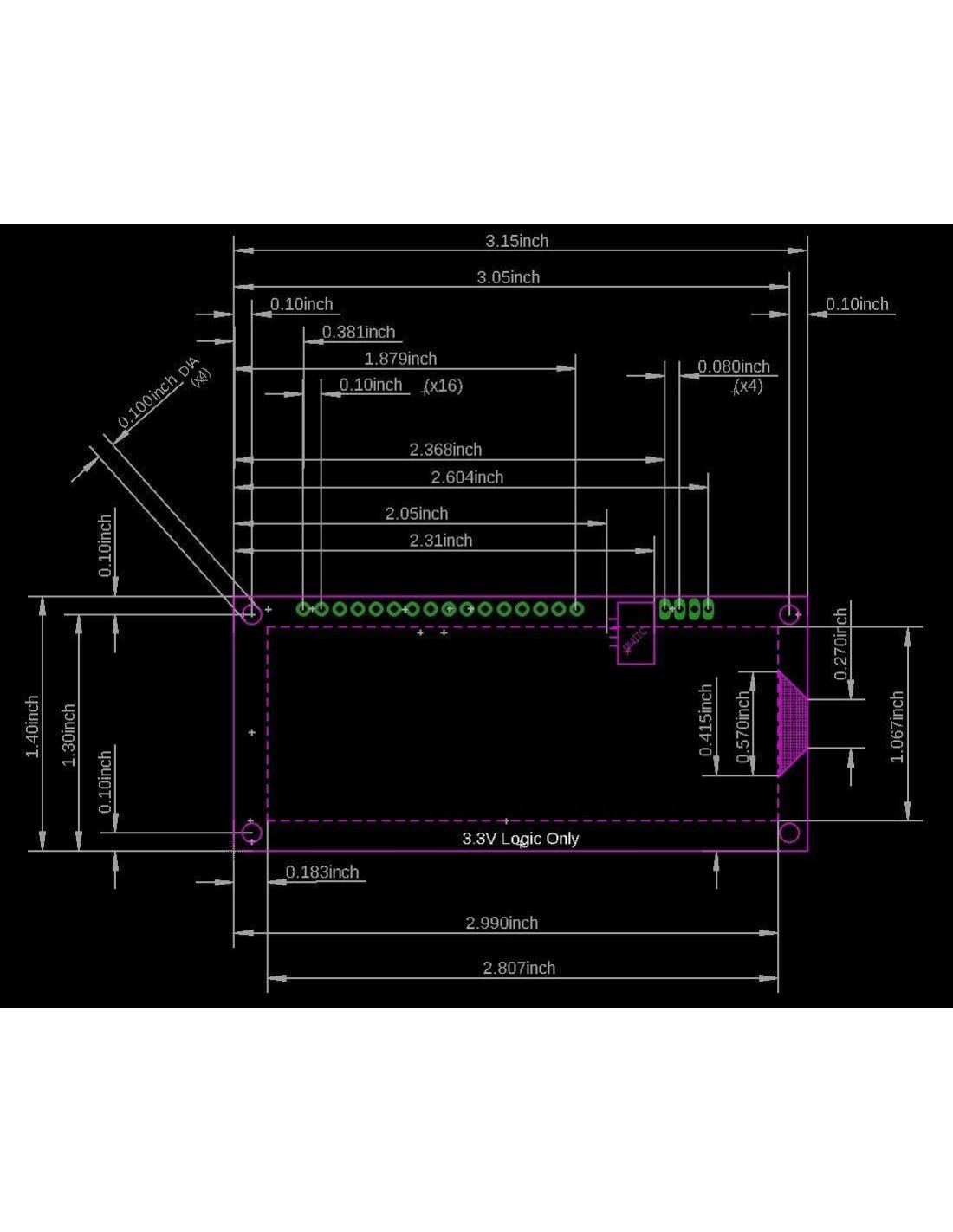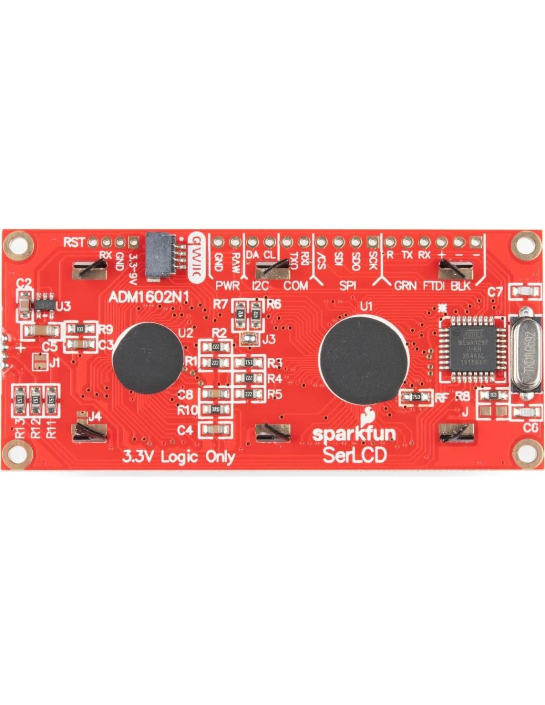 - El AVR ATMega328p (compatible con el bootloader de Arduino) está poblado en la parte posterior de cada pantalla LCD y maneja todo el control del LCD. Firmware de código abierto y compatible con el bootloader de Arduino permite actualizaciones a través del IDE.