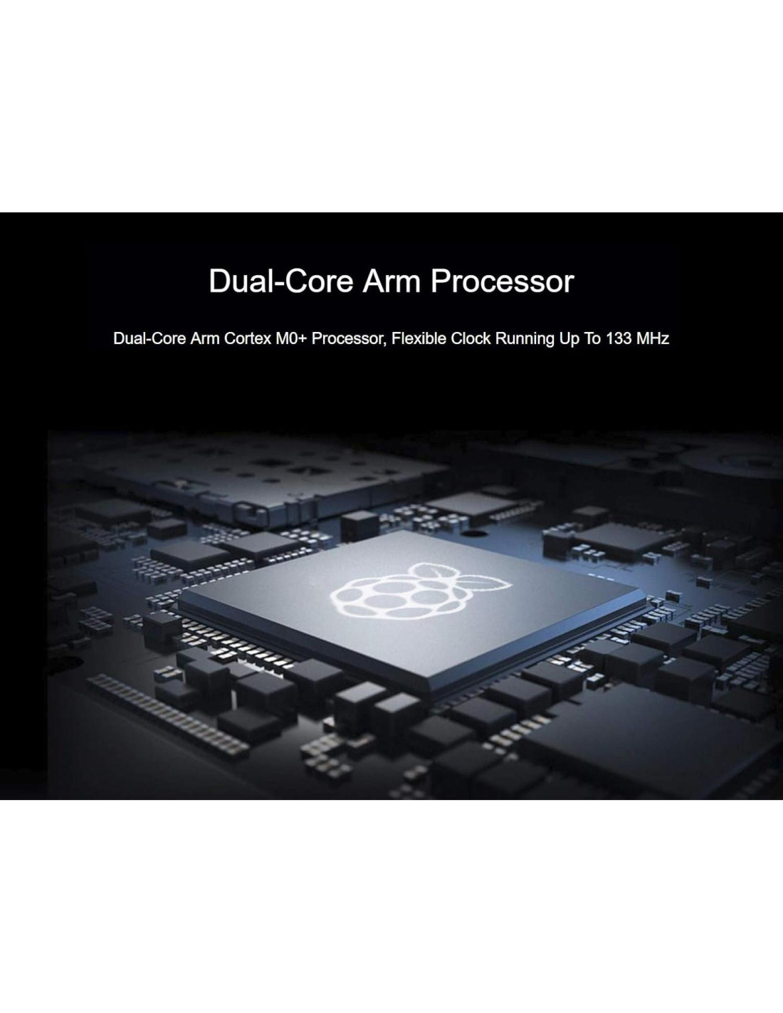 - La placa Raspberry Pi Pico incorpora el chip de microcontrolador RP2040 de Raspberry Pi, con procesador dual-core Arm Cortex M0+ que funciona hasta 133 MHz, 264KB de SRAM embebido y 2MB de memoria Flash a bordo, así como 26x pines GPIO multifuncionales.