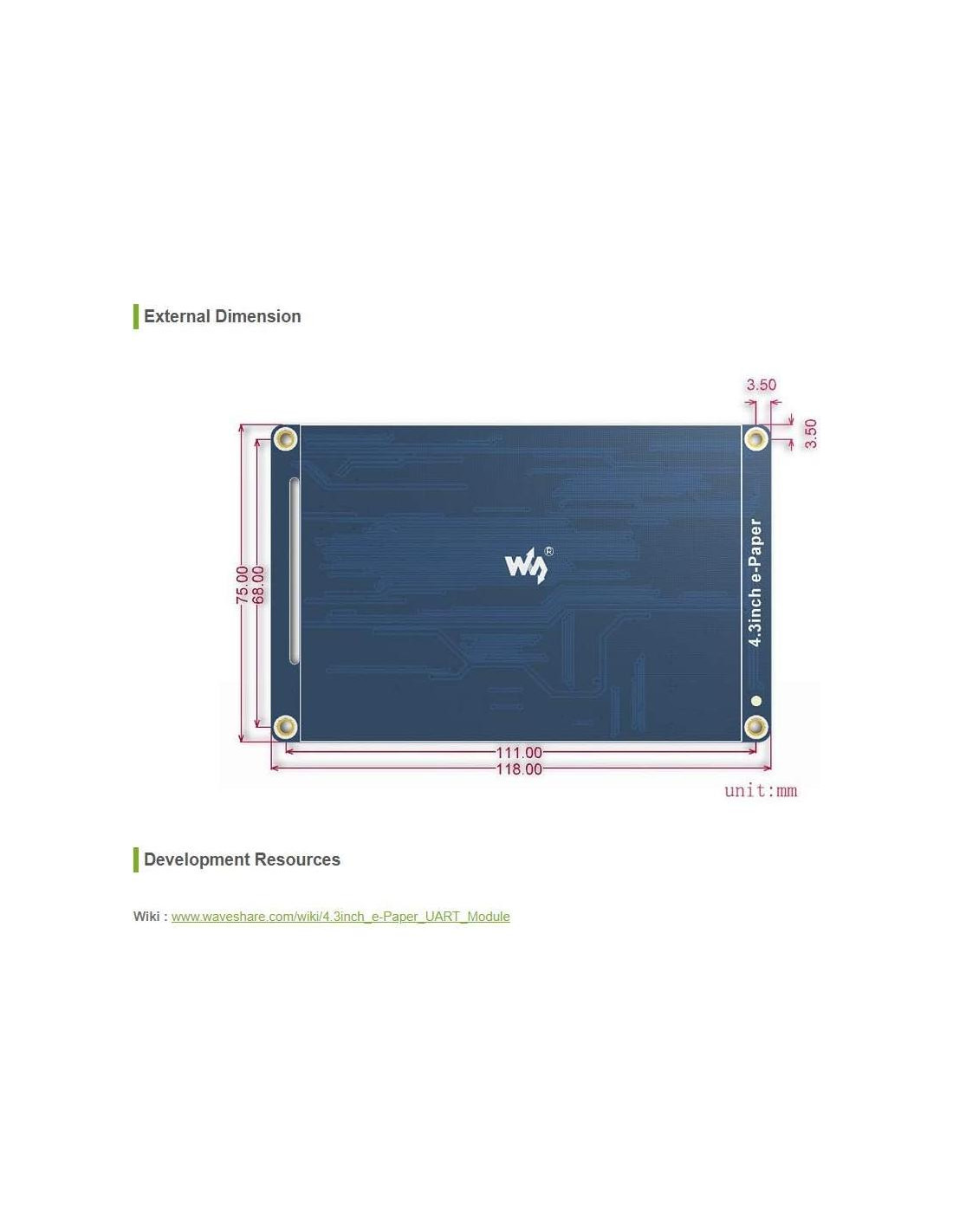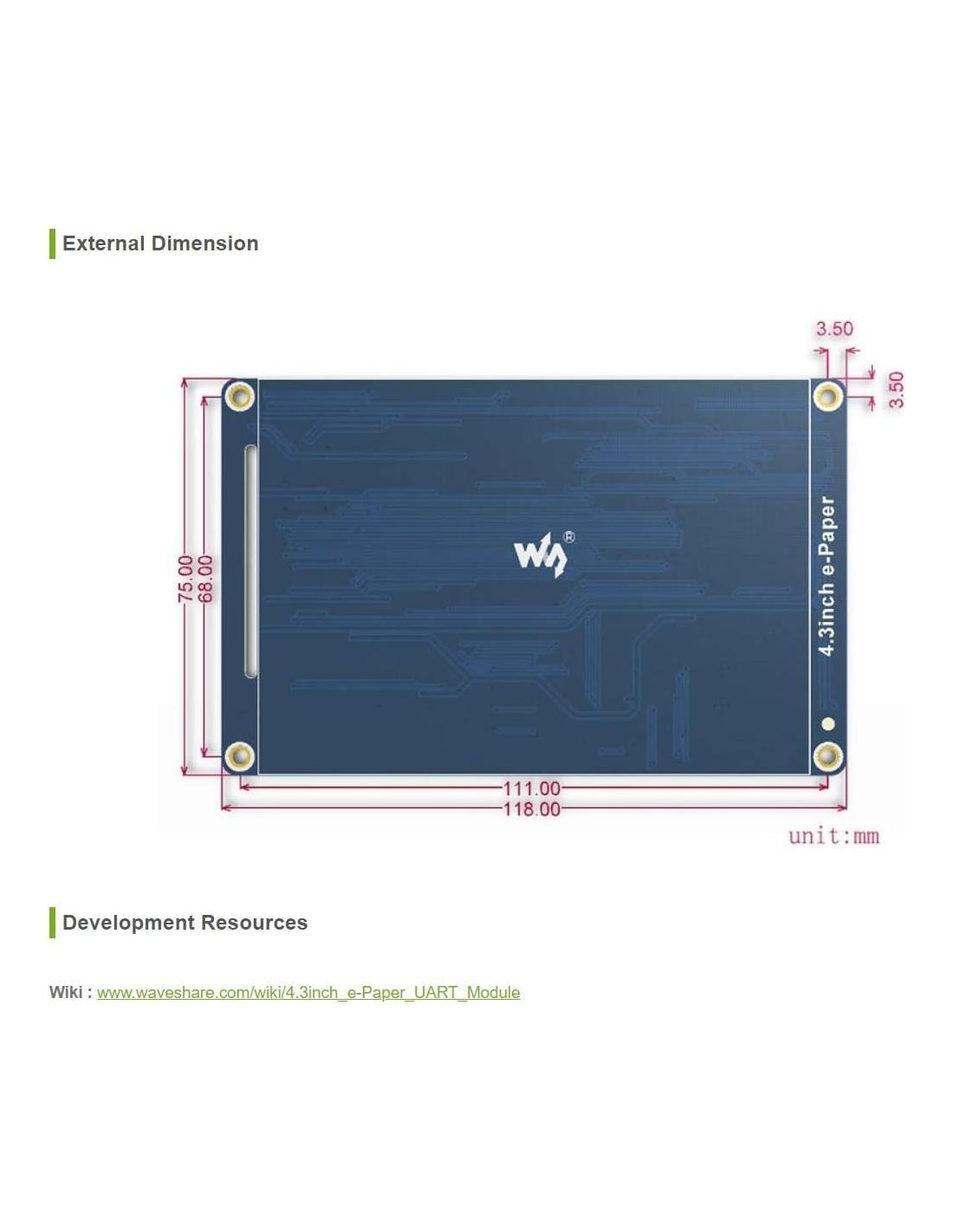 Descripción general Este es un módulo de pantalla E-Ink de interfaz serial, 4.3 pulgadas, resolución 800x600, con bibliotecas de fuentes integradas, consumo de energía ultra bajo. No necesitas saber nada sobre los complejos detalles subyacentes del e-Paper, ni los algoritmos específicos para mostrar gráficos, textos e imágenes. Todo lo que necesita es la interfaz serial, y lo que importa es tu creatividad. Características Fácil de usar, muestra cualquier contenido a través de una interfaz serial, incluyendo gráficos geométricos, textos e imágenes Bibliotecas de fuentes integradas, soporta fuentes chinas GBK de matriz de puntos 32, 48 y 64 y fuentes en inglés NandFlash de 128MB incorporado, permite que los datos de fuentes/imágenes se almacenen en una tarjeta TF externa o en el NandFlash interno 4 niveles de gris, resolución 800x600 Tasa de baudios de interfaz serial ajustable, 115200 por defecto al encenderse Alimentado de 3.3V a 5V, compatible con nivel lógico Consumo de energía ultra bajo, corriente en reposo inferior a 5mA Viene con software para computadora, controlalo directamente en tu computadora Aplicaciones libro electrónico Centro comercial POS Etiqueta de precio Instrumento industrial Definiciones de pines VCC: 3.3V~5.5V GND: GND DOUT: Salida de datos serial DIN: Entrada de datos serial WAKE_UP: Despertar externo RST: Reinicio externo Limitado por el procesamiento de hardware, generalmente toma 1.5s refrescar cada imagen de un solo cuadro, por lo tanto, este e-Paper NO es capaz de reproducir animaciones. CONTENIDO DEL PAQUETE Módulo e-Paper UART de 4.3 pulgadas x1 Cable de 6 pines XH2.54 x1 Recursos de desarrollo: Wiki: www.waveshare.com/wiki/4.3inch_e-Paper?amazon