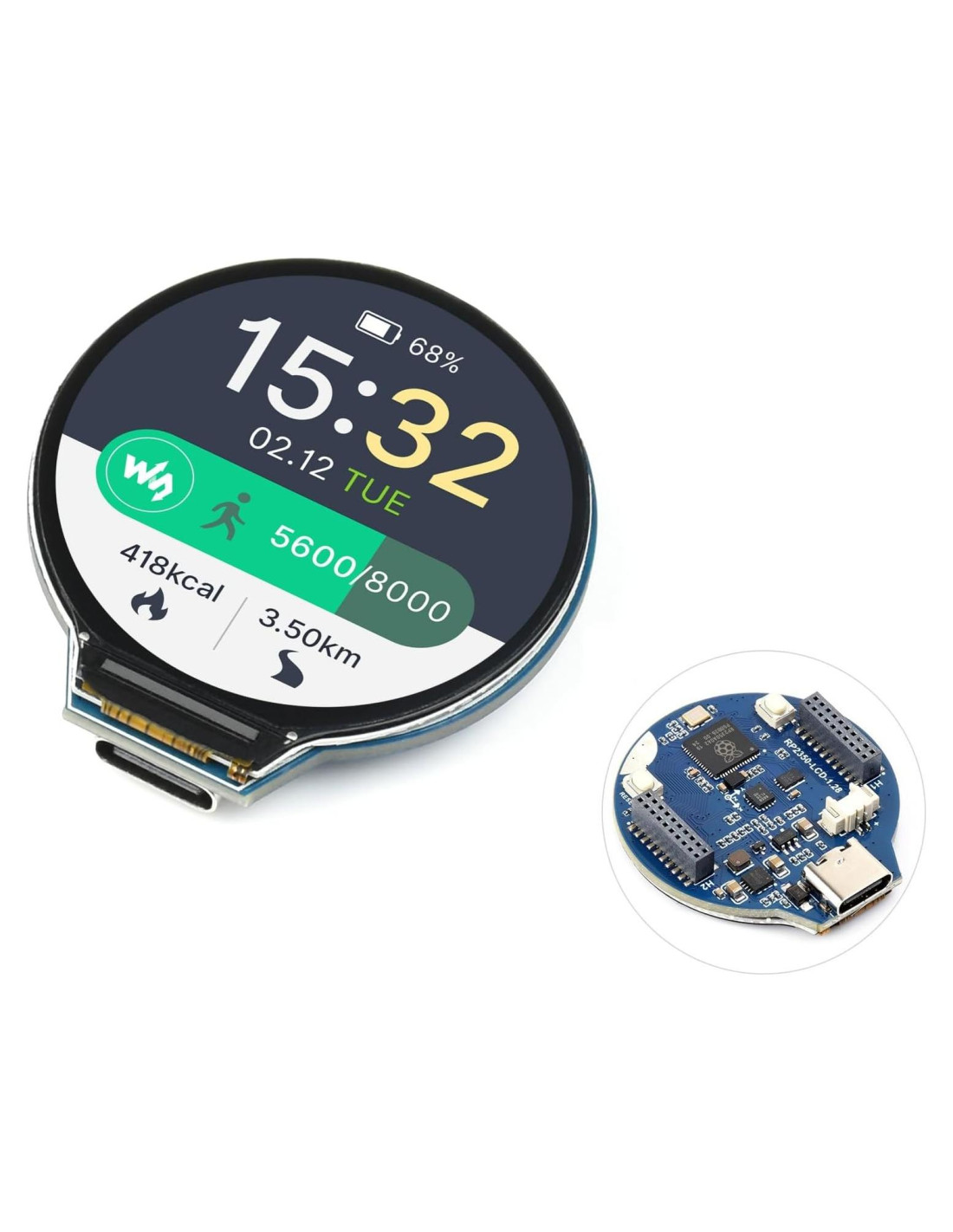Placa MCU RP2350, con LCD redondo de 1.28 pulgadas, diseño de doble núcleo y doble arquitectura, 240x240 píxeles, 65K colores, panel IPS. Características: RP2350-LCD-1.28 es una placa MCU de bajo costo y alto rendimiento diseñada por Waveshare. Tamaño pequeño con pantalla LCD redonda de 1.28 pulgadas, gestor de carga de batería de iones de litio, sensor de 6 ejes (acelerómetro de 3 ejes y giroscopio de 3 ejes) y más, adaptando todos los pines GPIO y de depuración, lo que facilita su desarrollo e integración en productos rápidamente. Las características clave incluyen: chip microcontrolador RP2350 diseñado por Raspberry Pi en el Reino Unido. Adopta un diseño único de doble núcleo y doble arquitectura: procesador Arm Cortex-M33 de doble núcleo y procesador RISC-V Hazard3 de doble núcleo, reloj flexible que funciona hasta 150 MHz, 520KB de SRAM y 4MB de memoria Flash a bordo. Conector tipo C, lo mantiene actualizado, más fácil de usar. Pantalla LCD IPS de 1.28 pulgadas y 240x240 píxeles 65K colores a bordo para imágenes en color claras. Encabezado de carga/descarga de batería de litio, adecuado para dispositivos móviles. Todos los pines GPIO están adaptados a través de cabezales hembra de 1.27 pitch (hay 30 pines en total, pero algunos pines están conectados al circuito interno, consulte la wiki para más detalles al multiplexar). USB 1.1 con soporte para dispositivo y host. Modos de bajo consumo, sueño y reposo. Programación de arrastrar y soltar utilizando almacenamiento masivo a través de USB. 2 * SPI, 2 * I2C, 2 * UART, 4 * ADC de 12 bits, 24 * canales PWM controlables. Sensor de temperatura. 12 * máquinas de estado de E/S programables (PIO) para soporte de periféricos personalizados. Contenido del paquete: RP2350-LCD-1.28 x1.