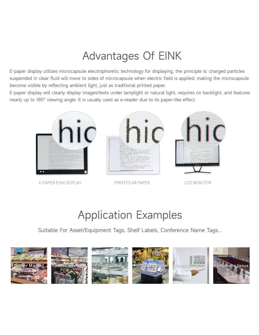 - Bajo consumo de energía, amplio ángulo de visión, efecto similar al papel sin electricidad, color Rojo/Negro/Blanco.