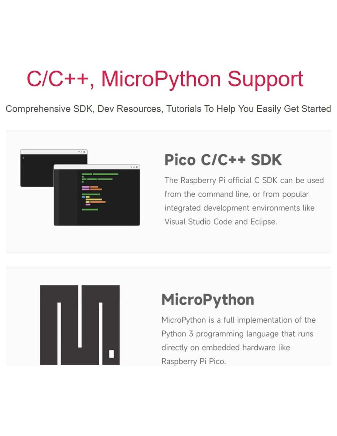 - Para el desarrollo de software, está disponible el SDK C/C++ de Raspberry Pi o MicroPython, recursos de desarrollo en línea completos y tutoriales para ayudarte a comenzar fácilmente. No dudes en contactarnos para más información