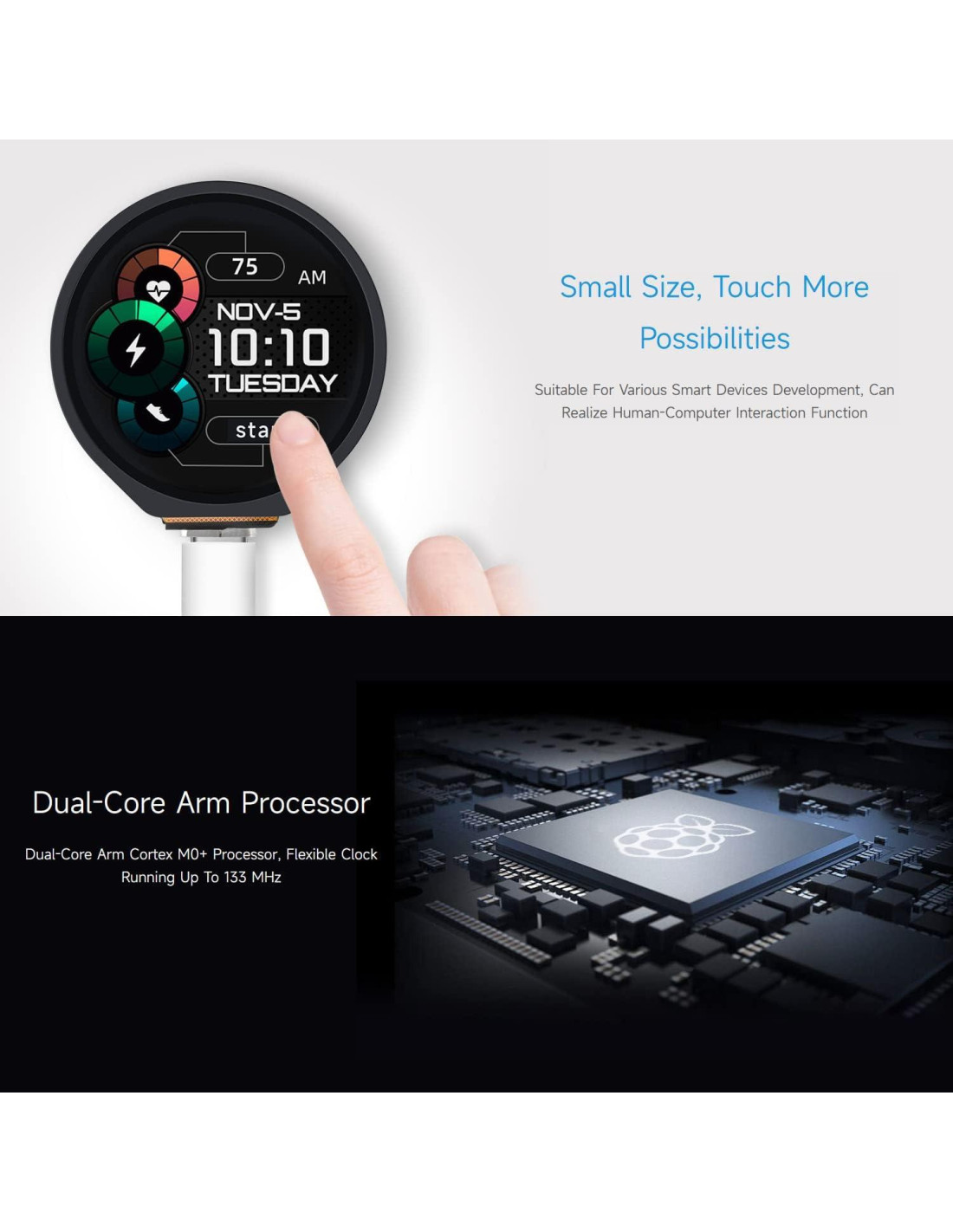 RP2040-Touch-LCD-1.28 es una placa MCU de bajo costo y alto rendimiento diseñada por Waveshare, de tamaño pequeño, con pantalla táctil capacitiva de 1.28 pulgadas integrada, gestor de recarga de batería de Li-ion, sensor de 6 ejes (acelerómetro de 3 ejes y giroscopio de 3 ejes), y así sucesivamente, lo que facilita el desarrollo y la integración en productos rápidamente.