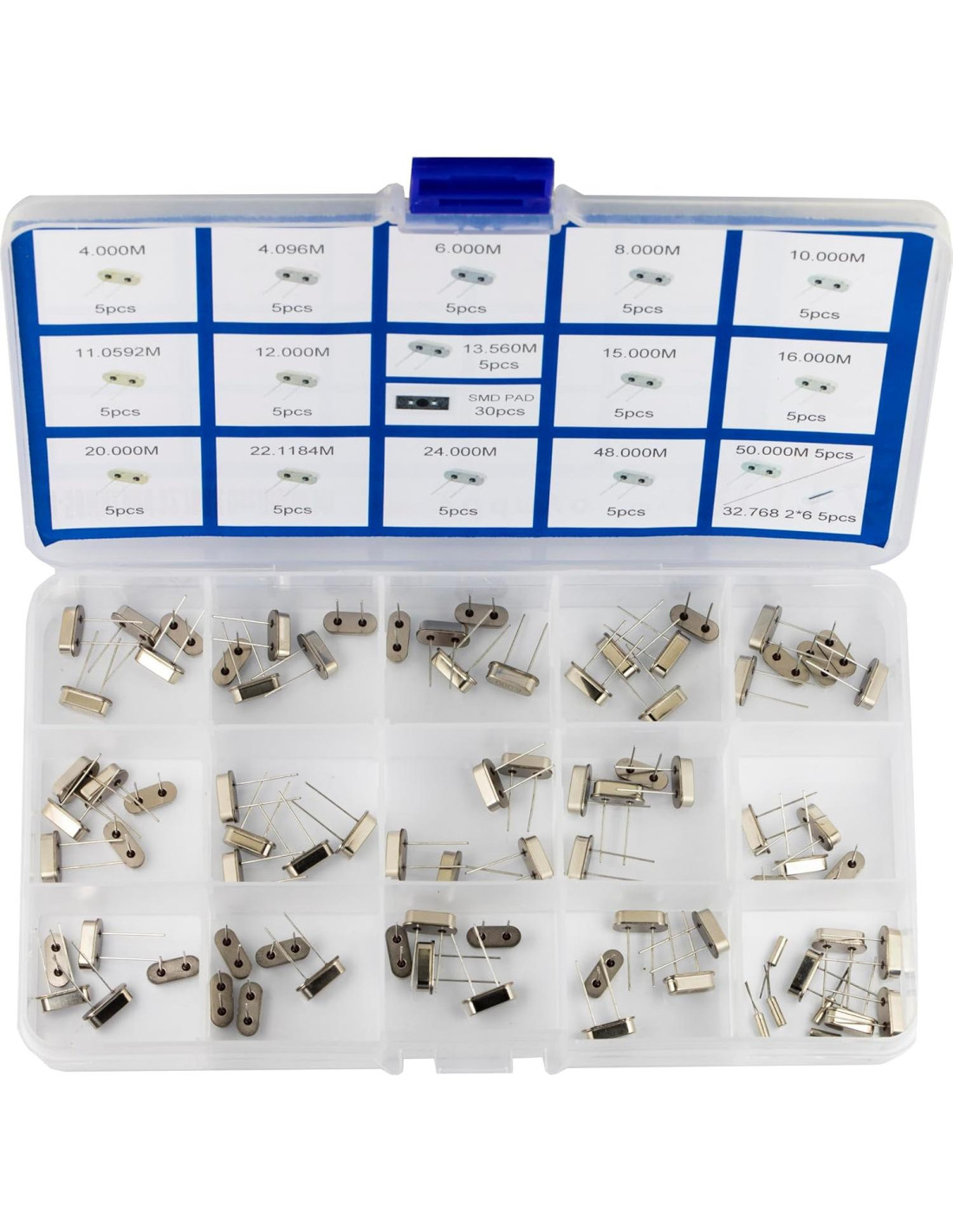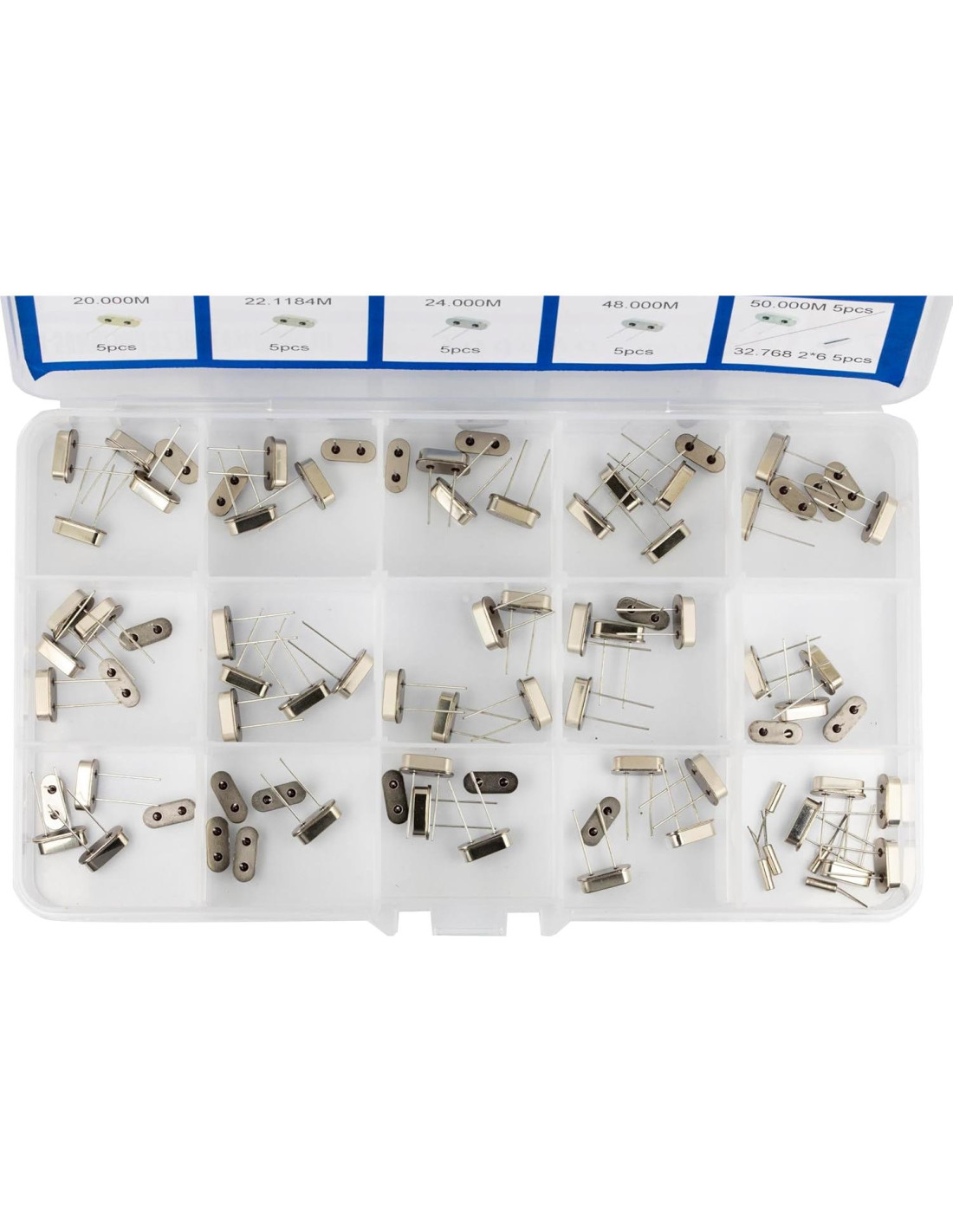 - 16Valores / Cada 5Pcs: 4MHz, 4.096MHz, 6MHz, 8MHz, 10MHz, 11.0592MHz, 12MHz, 13.56MHz, 15MHz, 16MHz, 20MHz, 22.1184MHz, 24MHz, 32.768Mhz (2x6mm), 48MHz, 50Mhz