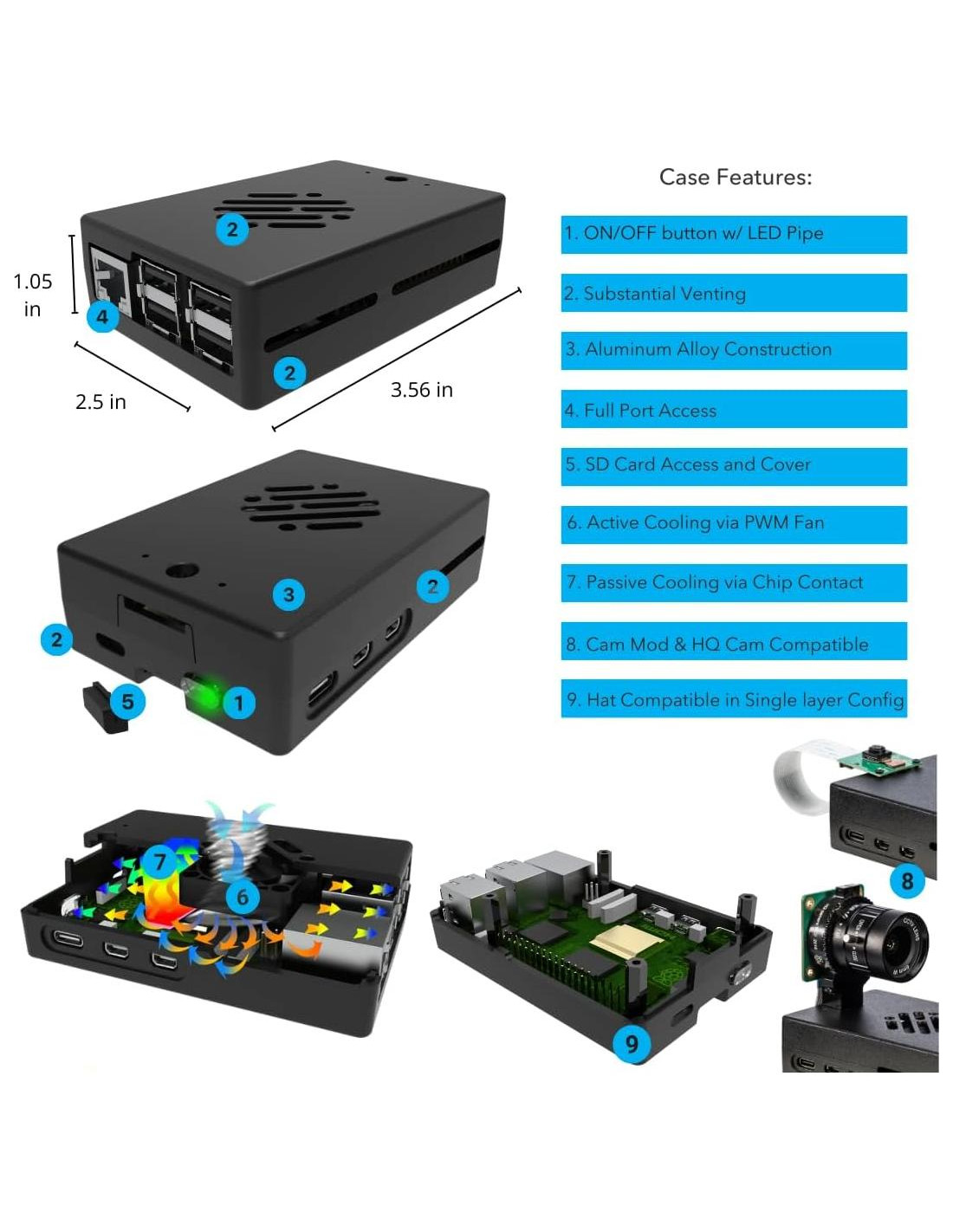 - El kit incluye una caja de refrigeración pasiva de construcción sólida que también tiene un ventilador y ajusta la velocidad del ventilador según la temperatura, asegurando un enfriamiento y rendimiento óptimos.