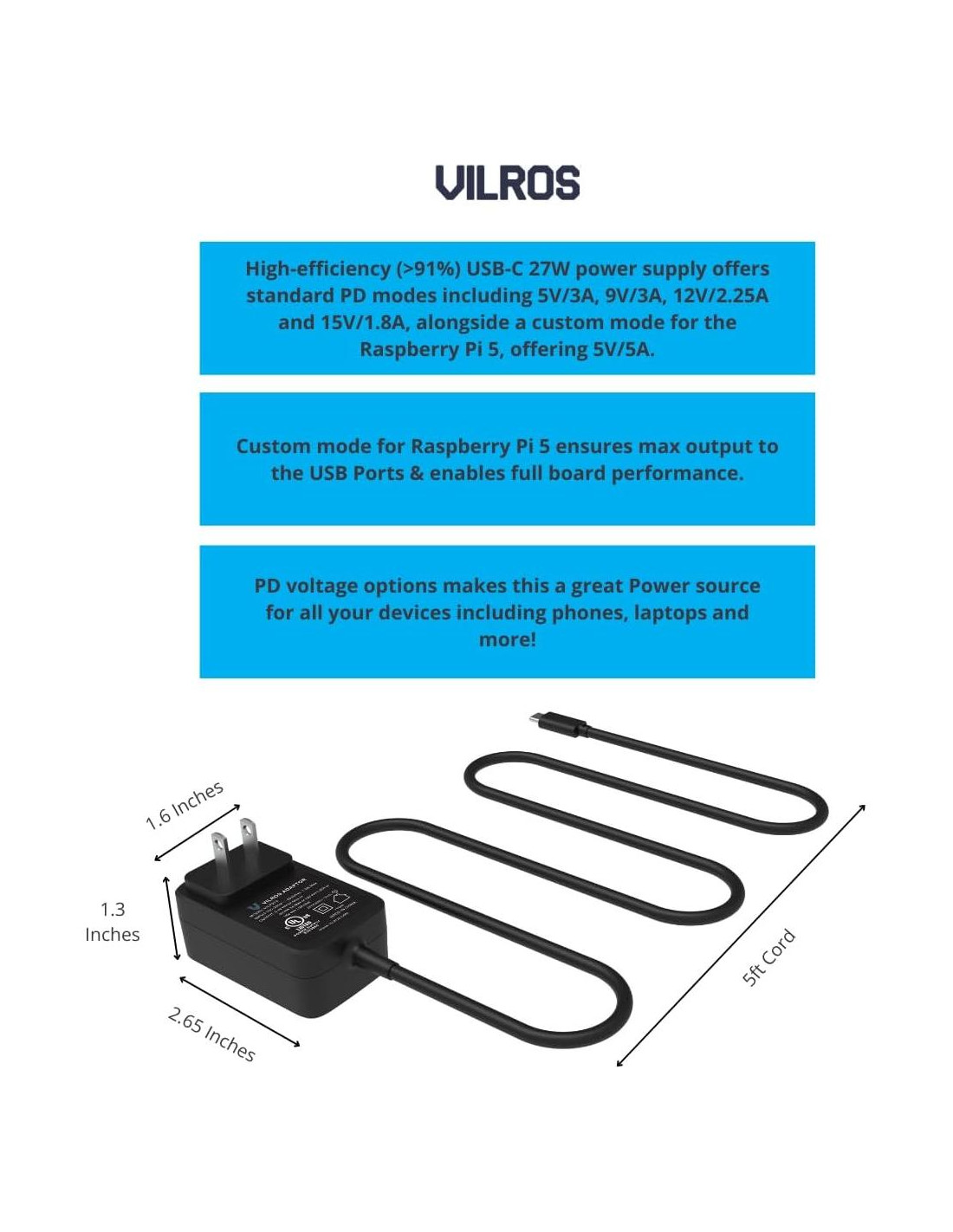 Kit de inicio completo de Vilros Raspberry Pi 5 con caja de aleación de aluminio refrigerada pasivamente y activamente. Esta nueva placa de circuito flexible (lanzada en octubre de 2023) puede reemplazar tu computadora de escritorio y ser utilizada para una amplia gama de proyectos pragmáticos y no pragmáticos. Aunque este hardware puede parecer intimidante para los novatos, es uno de los kits más básicos disponibles para comenzar a construir tu propia computadora. Además, viene con una guía de inicio rápido que te ayudará a ensamblar tu procesador con facilidad. La característica más atractiva de la Raspberry Pi 5 es su potencia con un factor de forma tan pequeño y su flexibilidad. Este kit te permite utilizar completamente la placa sin miedo a la reducción de rendimiento debido al sobrecalentamiento, ya que incluye una caja que enfría pasiva y activamente la Raspberry Pi 5 a través del contacto del disipador de calor con la placa, así como un ventilador PWM compatible con Pi 5. Lo que incluye este kit completo de Vilros Raspberry Pi 5: Raspberry Pi 5 (elige capacidad en GB) Caja de refrigeración de aleación de metal-aluminio pasiva + activa con botón LED de encendido/apagado integrado Fuente de alimentación compatible con Vilros Raspberry Pi 5 Ventilador PWM con capacidad máxima de 10k RPM (integrado en la caja) Tarjeta Micro SD de 128GB cargada con Raspberry Pi OS (64 bits) Adaptador de Micro SD a USB 2x Cables HDMI a Micro-HDMI de 5 pies Guía de inicio rápido, cuarta edición (actualizada para Pi 5) Bolsa de almacenamiento de neopreno Adaptador de cable de módulo de cámara mini a estándar para usar un módulo de cámara con un Pi 5. Usos incluyen: Reemplazo de computadora de escritorio, configuraciones de juegos retro, construcción de servidores web, construcción de una cámara de stop-motion, construcción de servidores de juegos en red multijugador (compatible con juegos de código abierto como Minecraft, Quake y Doom), control de robots, creación de videos en time-lapse, reproducción de medios audiovisuales, impresión de documentos desde impresoras obsoletas, construcción de una herramienta de monitoreo de red y mucho más. Nota: Teclado, ratón y monitor no incluidos.