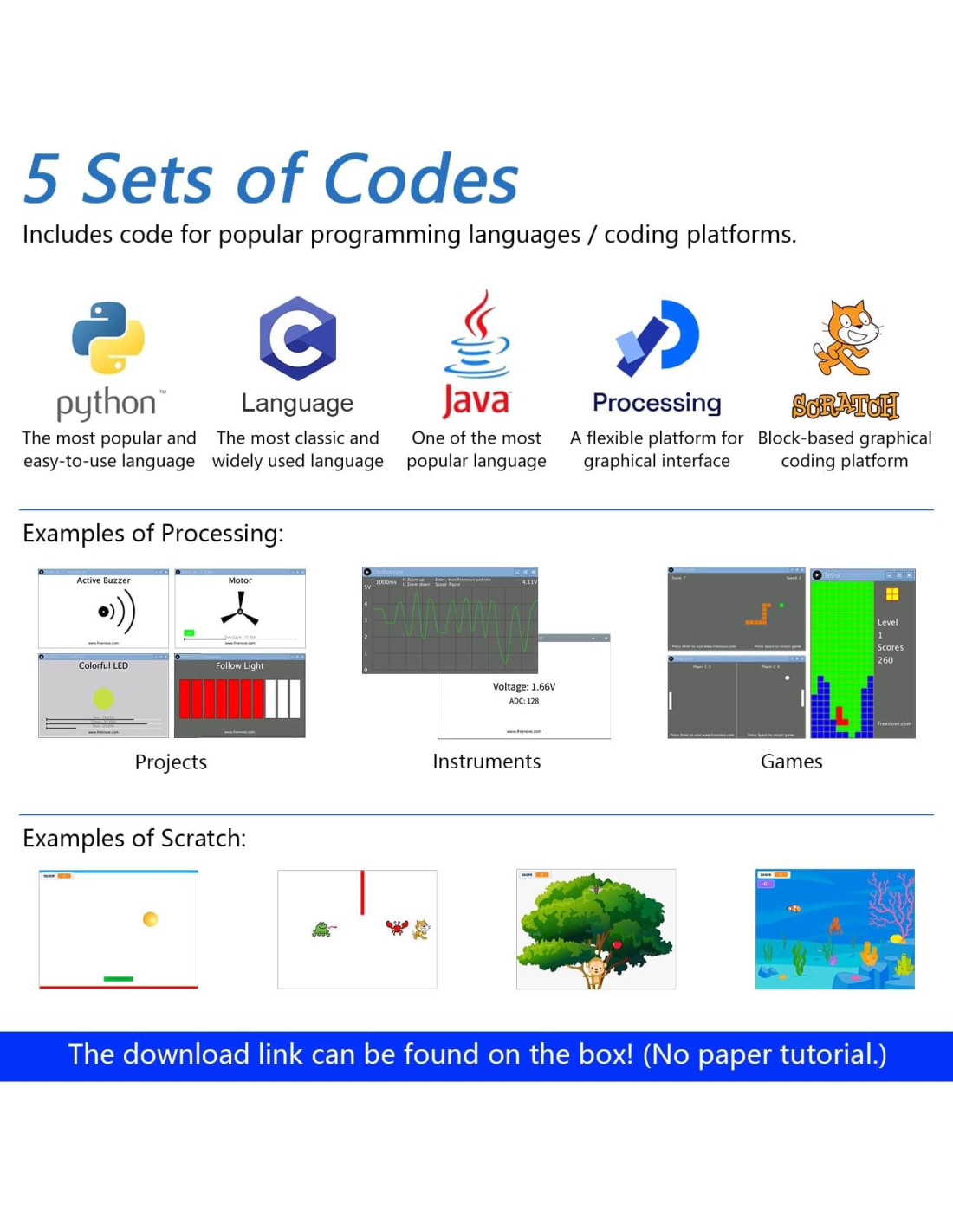 - 5 Conjuntos de Códigos: Python (compatible con 2&3), C, Java, Scratch y Processing (los códigos de Scratch y Processing proporcionan interfaces gráficas)