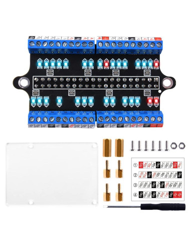 - Conector de 2x20 posiciones para conectar a la placa Raspberry Pi. El paso del bloque de terminales es de 2.54mm. Etiqueta de serigrafía para fácil identificación. El rango de calibre de cable es de 18 a 28AWG. La longitud de desforre es de 4.5mm.