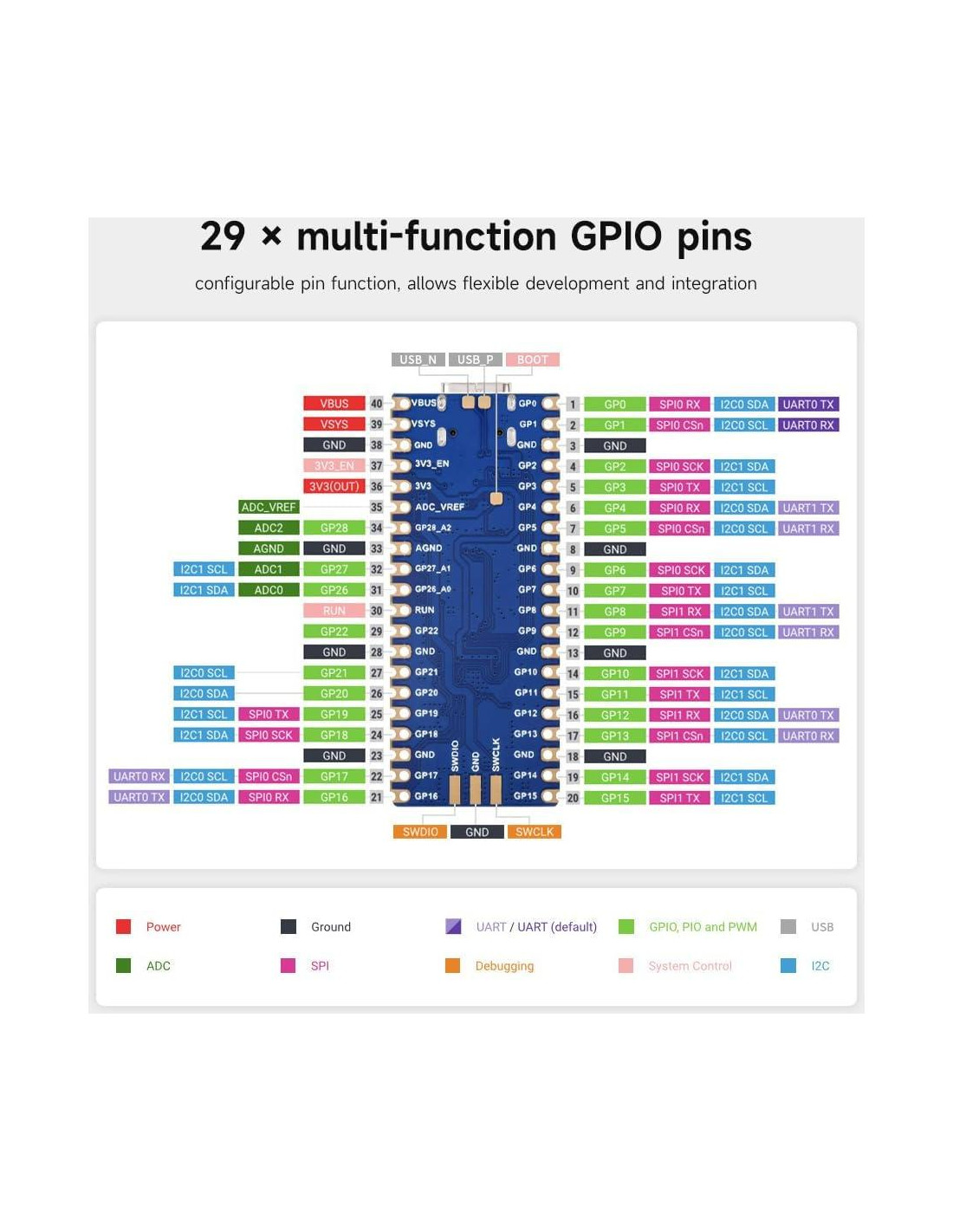 - Programación por arrastrar y soltar utilizando almacenamiento masivo a través de USB. 26 pines GPIO multifuncionales. 2 SPI, 2 I2C, 2 UART, 4 ADC de 12 bits, 16 canales PWM controlables. Reloj y temporizador precisos en el chip