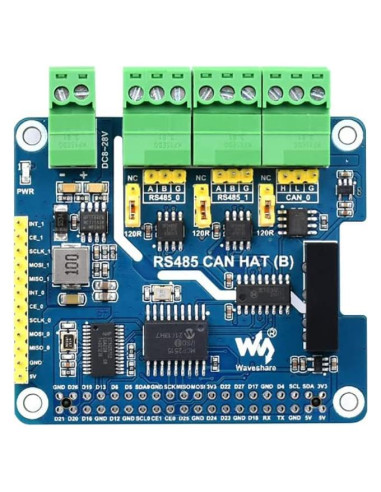 Características encabezado de extensión GPIO de 40PIN estándar para Raspberry Pi, soporta placas de la serie Raspberry Pi 1-Ch CAN, adopta controlador MCP2515 y transceptor CAN, convierte SPI a CAN 2-Ch RS485, adopta combinación de chip dual SC16IS752+SP3485, convierte SPI a RS485 Circuito de conversión de energía a bordo, soporta suministro de energía de voltaje amplio de 8~28V, puede alimentar la Raspberry Pi al mismo tiempo Aislamiento de suministro de energía unibody a bordo, proporcionando voltaje aislado estable, no se requiere fuente de alimentación adicional para el terminal aislado Aislamiento digital unibody a bordo, para aislar la señal, confiable y a prueba de interferencias, bajo consumo de energía TVS (Supresor de Voltaje Transitorio) a bordo, suprime efectivamente el voltaje de sobretensión y el voltaje de pico transitorio en el circuito, a prueba de rayos y anti-electrostático Fusible reiniciable y diodos de protección a bordo, aseguran salidas de corriente/voltaje estables, proporciona prueba de sobrecorriente/sobrevoltaje, mejora la resistencia a choques Resistor terminal de 120 a bordo, configurado por jumper Terminales y cabezales de pines a bordo, conexión más conveniente Pines de control SPI de salida, para conectar con placas de control anfitrionas El paquete incluye 1. HAT RS485 CAN (B) x1 2. Cabezal hembra de 2x20PIN x1 3. Paquete de tornillos x1 Recursos disponibles: https://www.waveshare.com/wiki/RS485_CAN_HAT_(B)