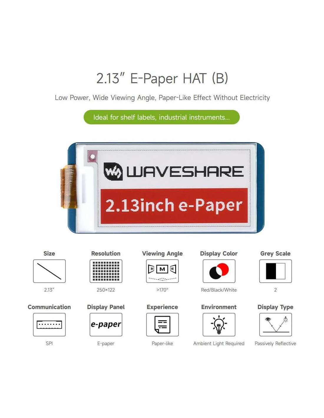 Descripción general Esta es una pantalla E-Ink HAT para Raspberry Pi, 2.13 pulgadas, resolución 212x104, con controlador integrado, comunicándose a través de la interfaz SPI, soporta pantalla de tres colores: rojo, negro y blanco. Debido a las ventajas como el ultra bajo consumo de energía, amplio ángulo de visión, y visualización clara sin electricidad, es una opción ideal para aplicaciones como etiquetas de estantería, instrumentos industriales, etc. Características Sin retroiluminación, mantiene la última información durante mucho tiempo incluso cuando se apaga. Ultra bajo consumo de energía, básicamente solo se requiere energía para la actualización. Conector de expansión GPIO de 40 pines estándar de Raspberry Pi, soporta placas de la serie Raspberry Pi, interfaz SPI de Jetson Nano, para conectar con otras placas de control como Arduino/Nucleo, etc. Traductor de voltaje a bordo, compatible con MCUs de 3.3V/5V. Viene con recursos de desarrollo y manual (ejemplos para Raspberry Pi/Jetson Nano/Arduino/STM32) Especificaciones Voltaje de funcionamiento: 3.3V/5V Interfaz: SPI de 3 hilos, SPI de 4 hilos Dimensiones externas: 65mm x 30.2mm Tamaño de la pantalla: 23.71mm x 48.55mm Pitch de puntos: 0.229 x 0.228 Resolución: 212 x 104 Color de la pantalla: rojo, negro, blanco Nivel de gris: 2 Tiempo de actualización completo: 15s Potencia de actualización: 26.4mW (típico) Potencia en espera: <0.017mW Ángulo de visión: >170 Recursos de desarrollo Wiki: www.waveshare.com/wiki/2.13inch_e-Paper_HAT_(B)?Amazon Contenido del paquete HAT e-Paper de 2.13 pulgadas (B) x1 Paquete de tornillos RPi (2 piezas) x1 PH2.0 20cm 8Pin x1