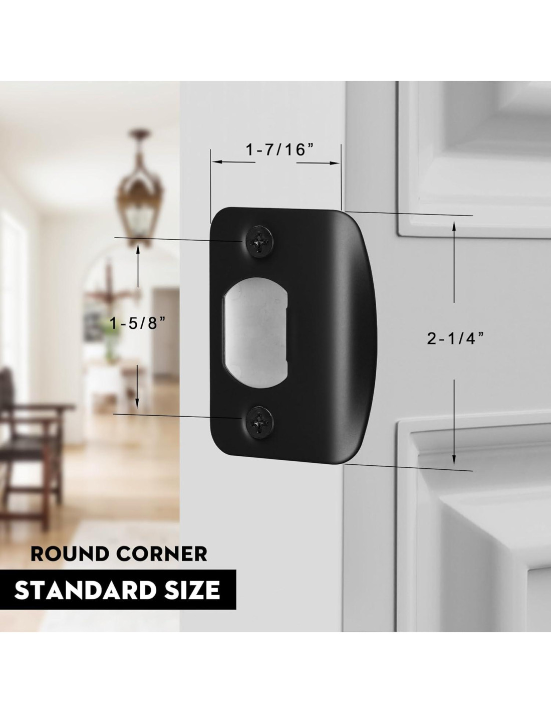 - Placa de golpe estándar: Aplicable a aberturas de golpe de puerta estándar en el marco de la puerta, sin necesidad de cortar el marco para un ajuste perfecto. Reemplazo directo para cualquier placa de pestillo con agujeros para tornillos espaciados 1-5/8" (4,13 cm). Funciona a la perfección con pomos de puerta y manijas de palanca.