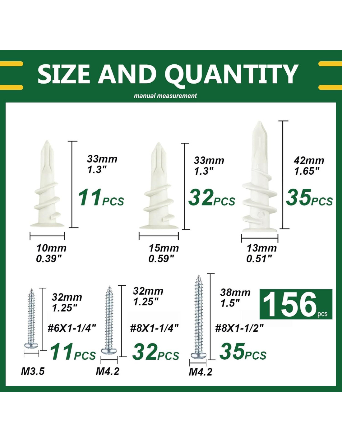 - [TAMAÑO] Anclajes de 15x33mm 32pcs, Anclajes de 14x42mm 35pcs, Anclajes de 10x33mm 11pcs, Tornillos #8 x 1-1/4'' (31.75mm) 32pcs, Tornillos #8 x 1-1/2'' (38.1mm) 35pcs, Tornillos #6 x 1-1/4'' (31.75mm) 11pcs y vienen en una caja para un fácil acceso. ATENCIÓN: Si la velocidad es demasiado rápida, el tubo de expansión se volverá blando y no se podrá atornillar.