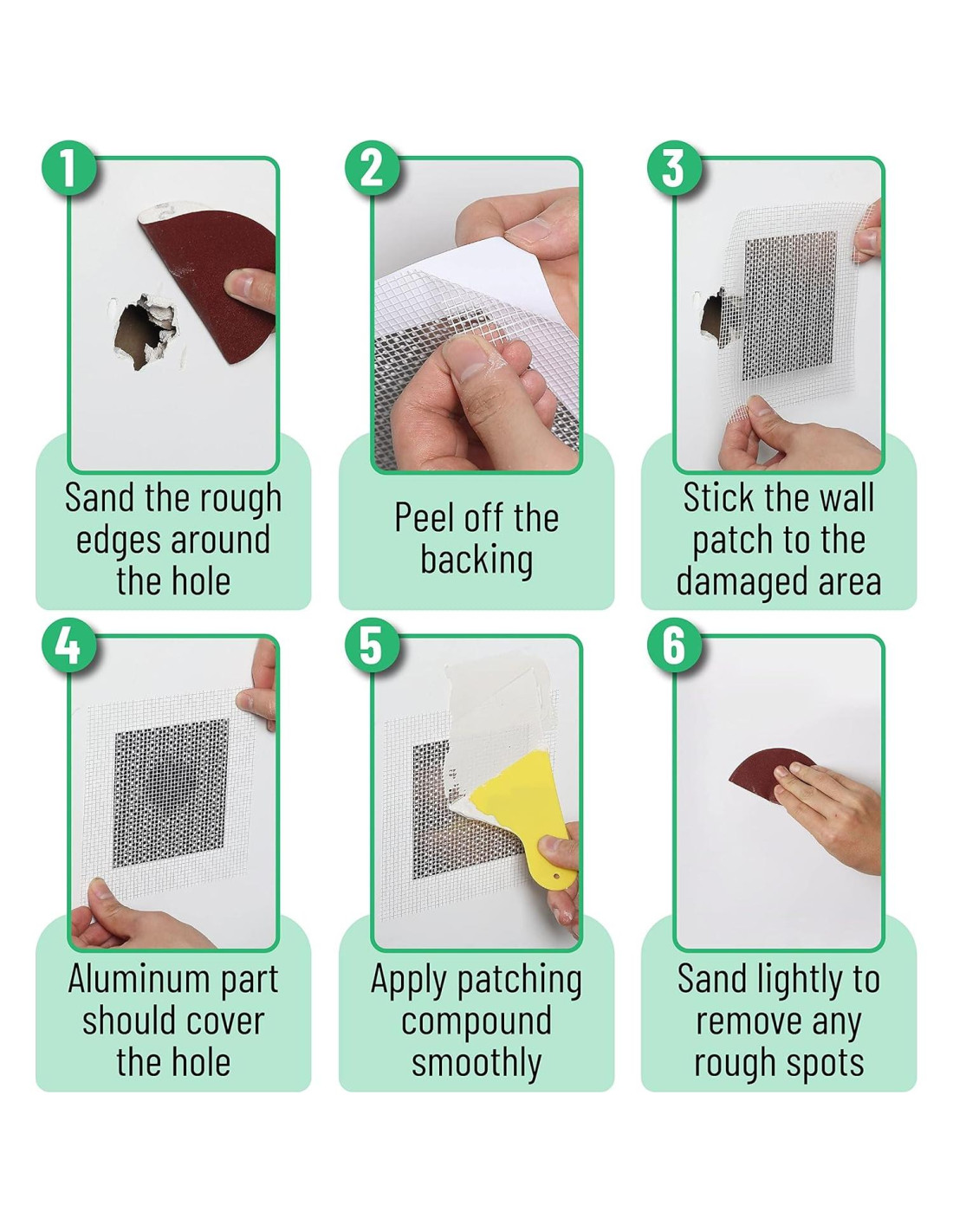 - Cada parche mide 15.24 cm, lo que los hace ideales para cubrir agujeros o grietas medianas a grandes en paredes y techos.