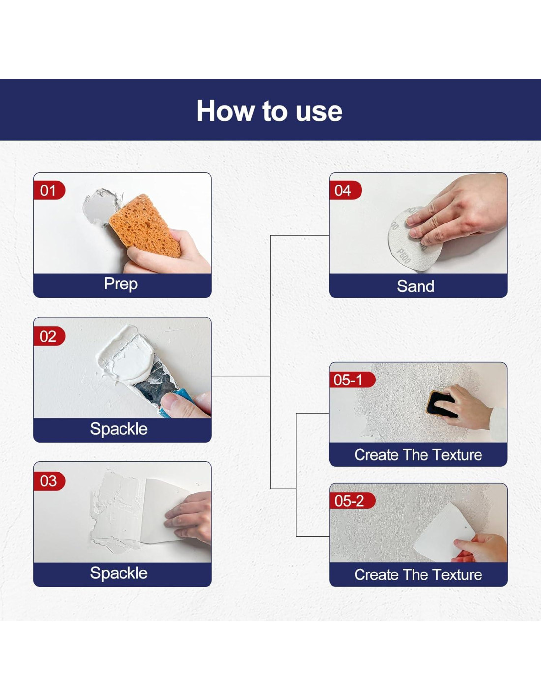 - Kit de Reparación Completo: Contiene 1 masilla para paredes premium (8.6oz), 3 raspadores, 1 esponja texturizada, 2 papeles de lija y 1 par de guantes, todo lo que necesitas está en un paquete, permitiéndote hacer el trabajo de reparación tú mismo como un profesional.