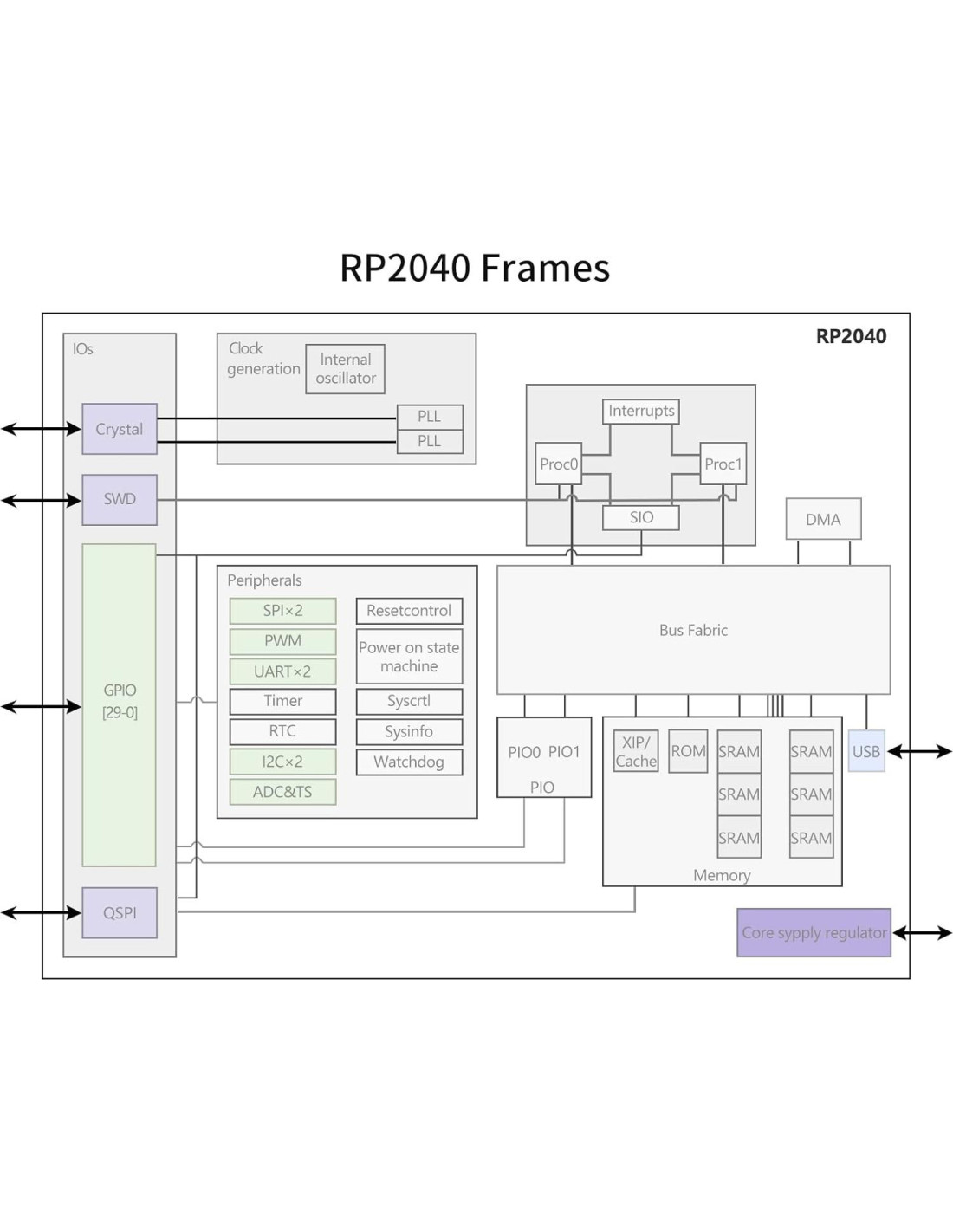 - Raspberry Pi RP2040 Microcontrolador Raspberry Pi Pico cuenta con un procesador ARM Cortex M0+ de doble núcleo, reloj flexible que funciona hasta 133 MHz. Con 264KB de SRAM y 2MB de memoria Flash a bordo. Soporta hasta 16 MB de memoria flash fuera del chip a través de un bus QSPI dedicado.
