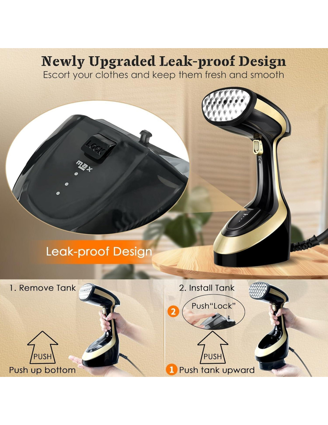 - Cómo Instalar/Retirar el Tanque de Agua del Vaporizador: La base del tanque de agua del vaporizador es un dispositivo mecánico "retractable" con resortes. Empuje el tanque de agua hacia arriba para retirarlo. Al instalar el tanque de agua, empújelo hacia arriba y escuchará un clic, y empuje manualmente el botón de "BLOQUEO" en su lugar. De esta manera, el vaporizador de ropa no filtrará agua durante su uso, y el tanque de agua no se caerá.
