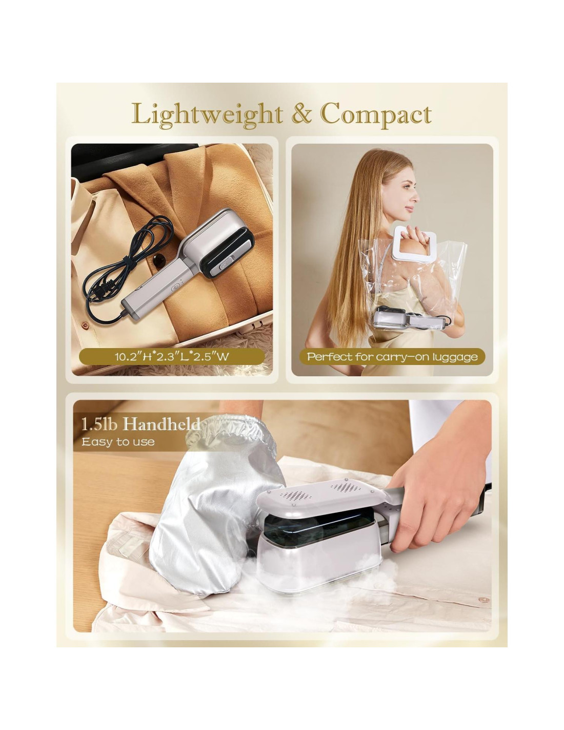 - [Vaporizador Seguro y Compacto] La plancha de vapor portátil está diseñada para ser portátil y compacta, lo que es adecuado para llevar en viajes de negocios y viajes para mantener tu ropa ordenada y limpia en cualquier momento y lugar. La plancha de vapor para ropa de tamaño compacto 10.2''H*2.5''L*2.3''W se adapta fácilmente en cajones o equipaje. Este vaporizador de plancha viene con una bolsa de almacenamiento portátil, es conveniente de usar sin preocupaciones de espacio. También tenemos dos guantes resistentes al calor para proteger tus manos durante el uso.