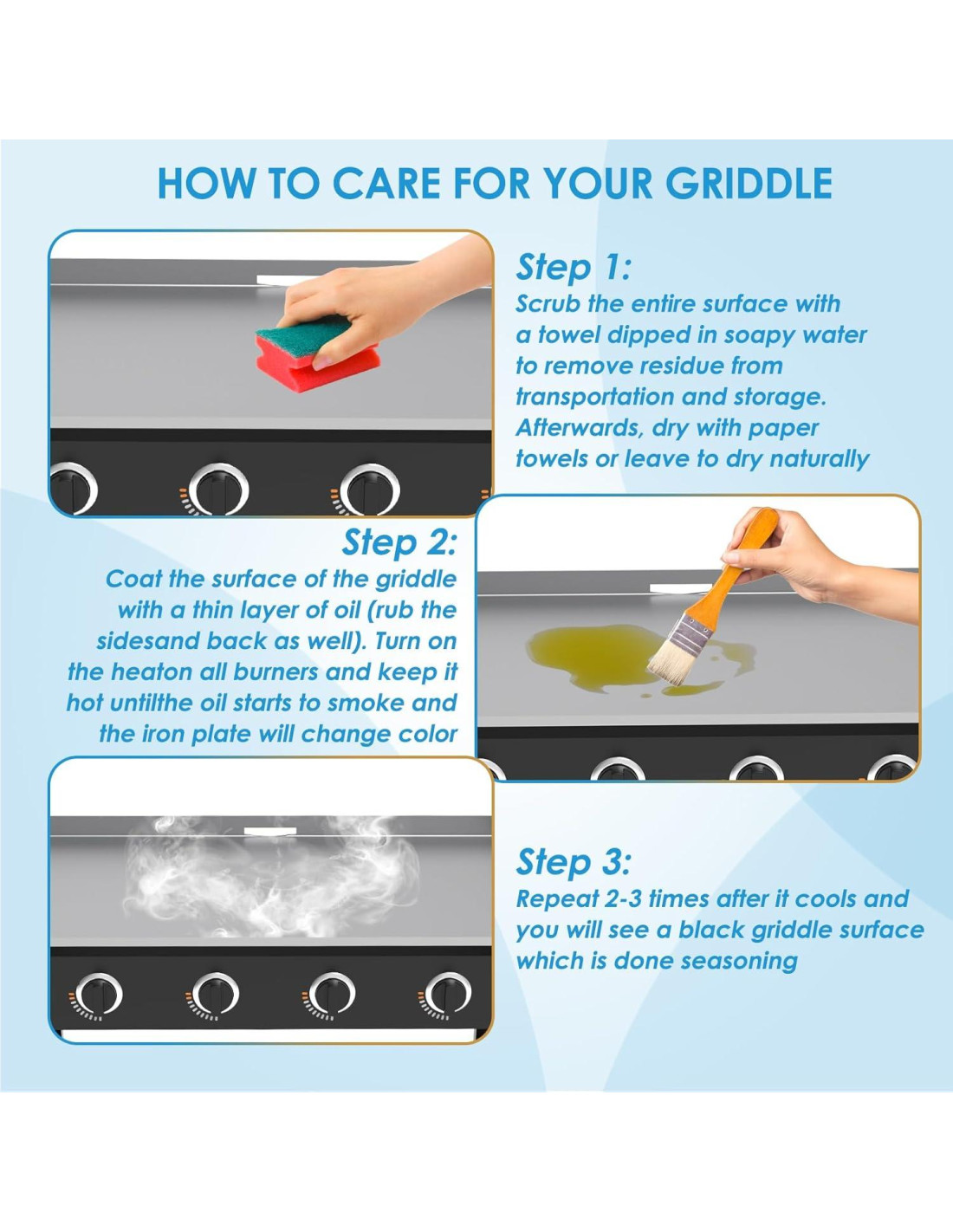 - Recomendaciones de mantenimiento: No hay recubrimiento químico en la superficie de nuestra plancha de mesa para Blackstone, el sazonado es muy importante y necesario. La primera vez que use una plancha nueva, lávela a fondo con jabón y séquela al aire. Unte una capa delgada de aceite en la superficie de la plancha (los lados y la parte posterior también son necesarios), caliéntela a alta temperatura hasta que humee, enfríela y repita la acción 2-3 veces, tenga paciencia y disfrute del proceso de unir el metal de la plancha al aceite
