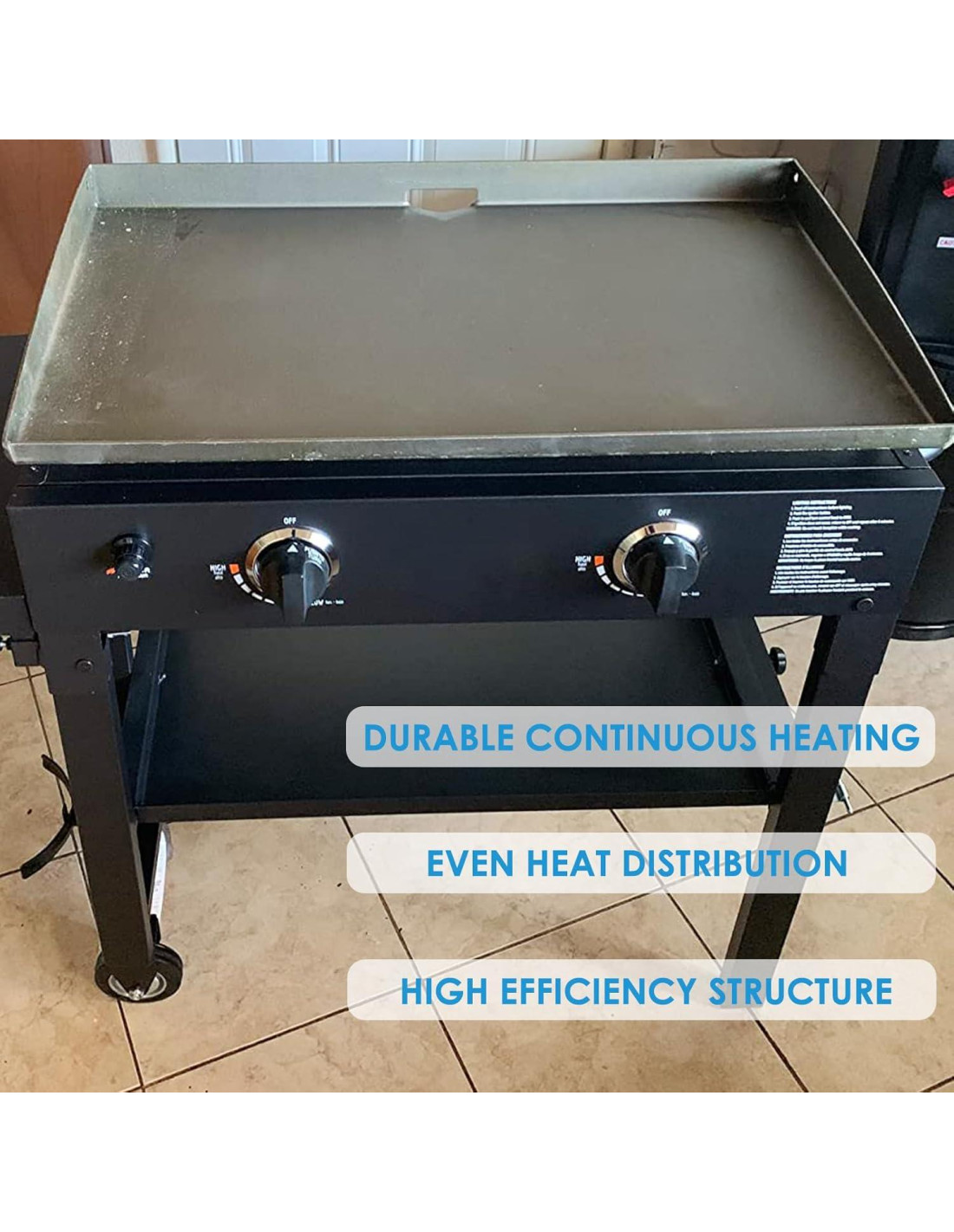 - Una solución eficiente: La superficie de la plancha de 28 pulgadas está construida con materiales duraderos diseñados para soportar altas temperaturas, asegurando una cocción uniforme y capacidades excepcionales de sellado. El diseño duradero en forma de X en la parte posterior reduce la probabilidad de que la placa de la plancha se deforme y proporciona una mejor recuperación de calor, para que pueda disfrutar de filetes, hamburguesas y perritos calientes perfectamente asados, o saborear el delicioso sabor de los favoritos del desayuno como panqueques, tocino y huevos