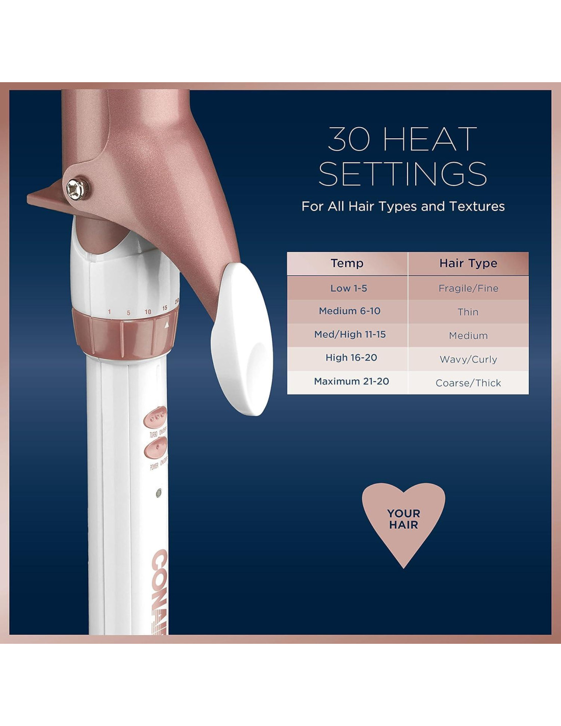 Presentamos la nueva plancha de rizar Doble Cerámica de 1 1/2 pulgadas color oro rosa diseñada para crear grandes y hermosas ondas suaves. El mayor contenido de cerámica ofrece un calor uniforme y estilos hermosos y duraderos con menos frizz. Con 30 configuraciones de calor que se calientan instantáneamente hasta 190.56 Grados F (190.56 Grados C) incluyendo el impulso de Turbo Calor para áreas difíciles de peinar. La punta fría única ofrece un manejo seguro y fácil y una función de apagado automático. Incluye voltaje dual para viajes internacionales y una bolsa de transporte adicional para empacar.