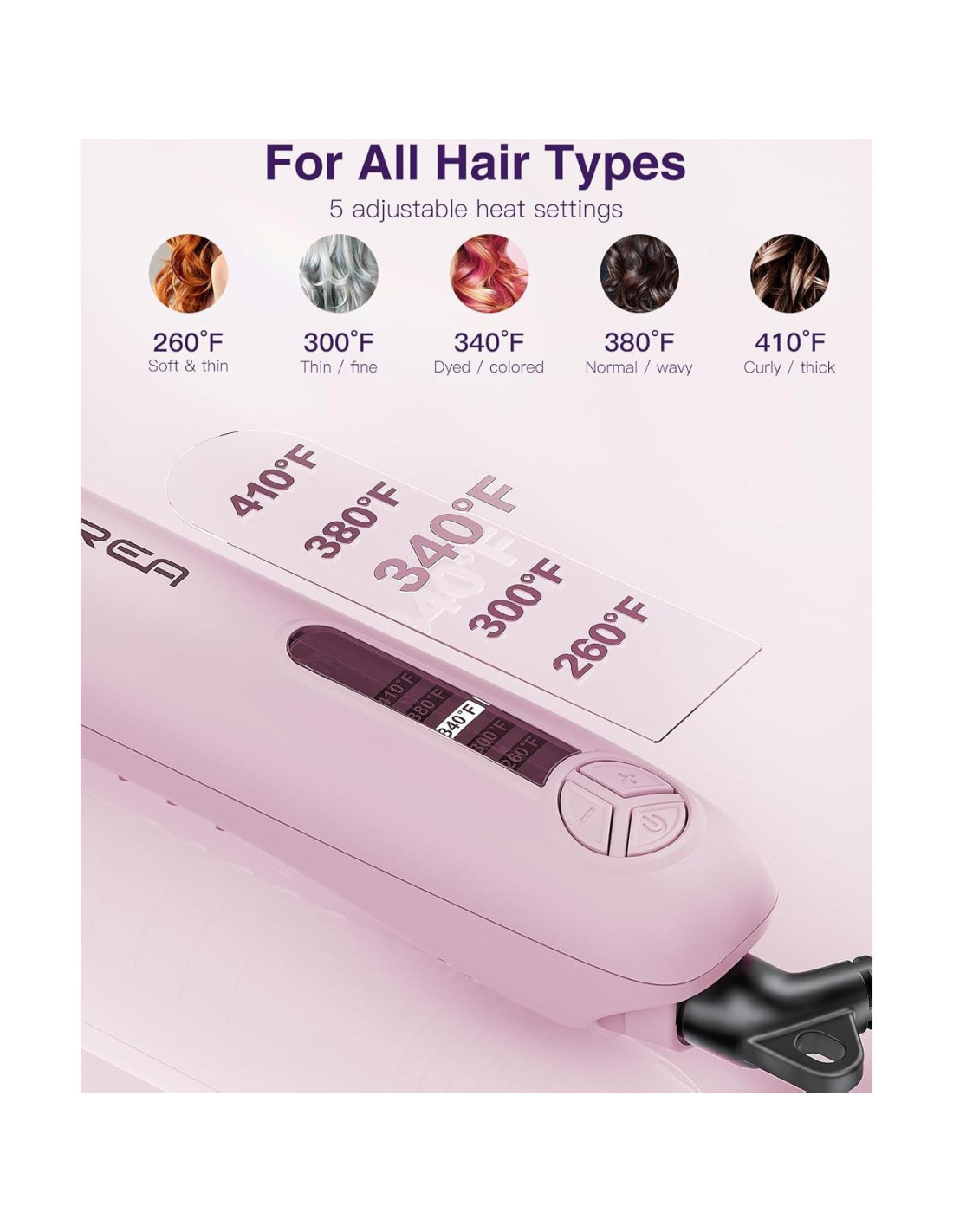 - Temperaturas Ajustables y Doble Voltaje: Ofrece 5 configuraciones de temperatura (260F (127C) a 410F (210C)) adecuadas para todos los tipos de cabello. Elige la temperatura perfecta para tu estilo. El cable giratorio de 8.2 pies (2.5 m) de 360 grados previene enredos y permite una fácil maniobrabilidad. Doble voltaje (100V-240V) permite uso global.