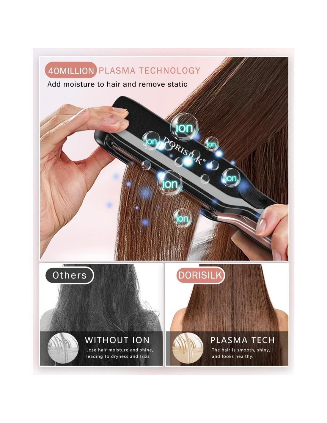 - Plancha de salón Dorisilk, que cuenta con un control de temperatura meticuloso y una rápida recuperación de temperatura, alcanza rápidamente una impresionante 500F (260C) para un estilizado constante y estable. Alisa eficientemente todos los tipos de cabello, desde rizos cortos hasta cabellos largos, en una sola pasada, incluso cabello grueso y áspero.
