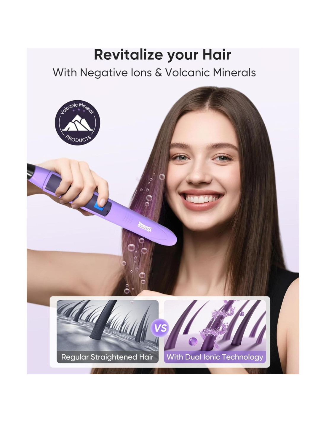 - Diseño Amigable para el Usuario: Cada detalle está diseñado para tu comodidad. El mango curvado ergonómico reduce la fatiga de la muñeca durante largas sesiones de peinado, mientras que la punta redondeada ayuda a prevenir quemaduras accidentales. El cable giratorio de 1.98 m (6.5 ft) de la plancha ofrece libertad de peinado, y la placa de cerámica de minerales volcánicos de 2.54 x 11.43 cm (1 x 4.5 pulgadas) es el tamaño universal ideal. Además, la compatibilidad de voltaje mundial asegura que puedas disfrutar de un peinado perfecto en cualquier lugar que viajes.