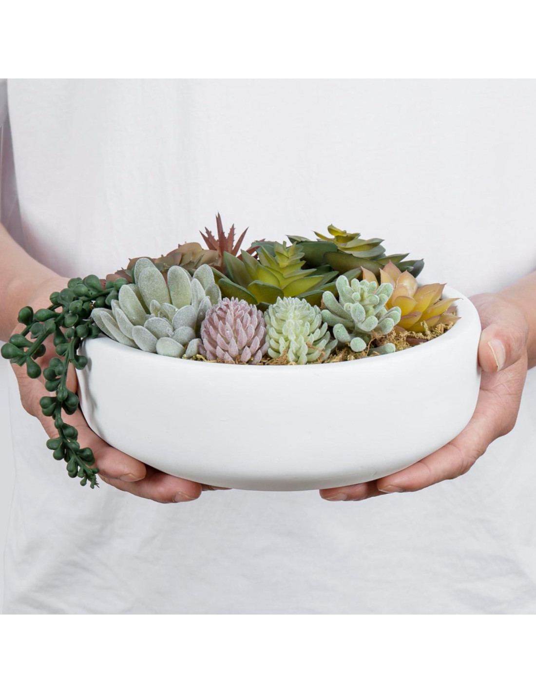 Agrega un toque de verdor a cualquier espacio con este surtido de suculentas mini falsas y una cadena de perlas en un tazón de concreto blanco de 8 pulgadas de diámetro.