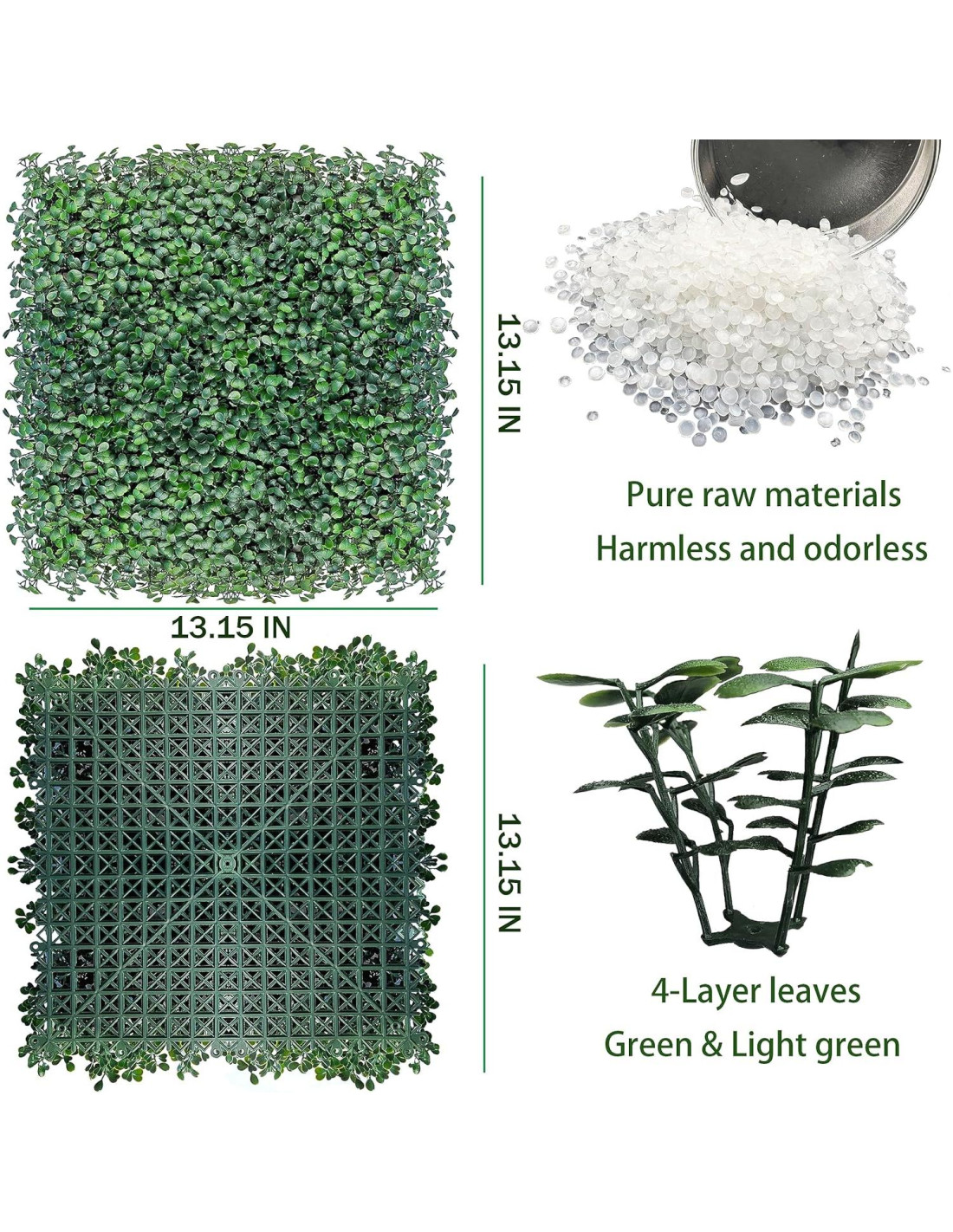 - Cada paquete tiene 12 paneles de buxo, cada panel de césped mide 13.15x13.15 pulgadas (33,5 x 33,5 cm), que puede cubrir 14.5 pies cuadrados (1,35 m). La altura de las hojas falsas es de 2 pulgadas (5,08 cm) (hojas de 4 capas), lo que tiene un buen efecto 3D. Cada panel tiene 128 hojas falsas, que son densas y pueden cubrir el fondo al 100%. Se regalan 50 nuevas bridas.
