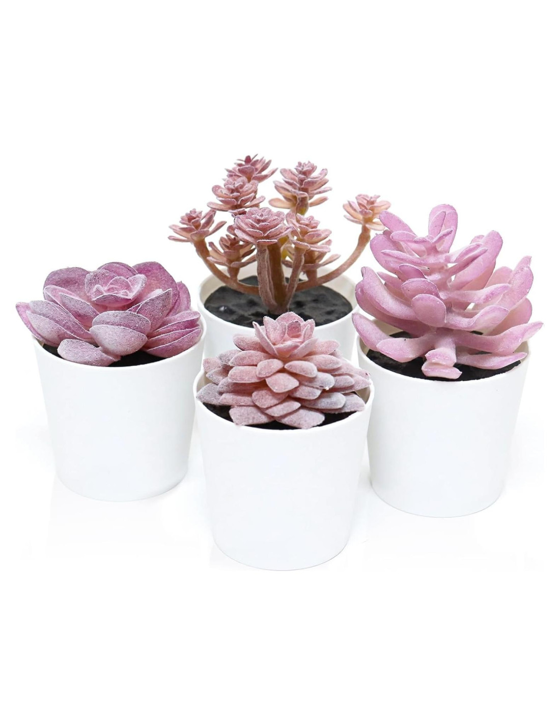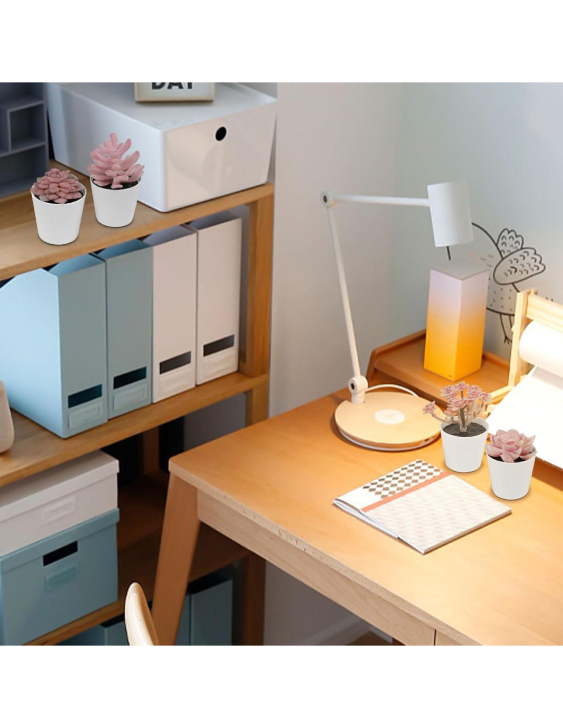 - [CINCO COLORES DE PLANTAS ARTIFICIALES] Esta planta suculenta artificial en maceta en miniatura viene en cinco colores, un juego de cuatro, las macetas son blancas y redondas en apariencia, cada juego de plantas falsas es diferente, pero combinan de manera muy armoniosa y con carácter, no es una maceta ordinaria, no es como esas macetas grandes, es pequeña y delicada, encantadora y adorable, viene con un aura de luz para atraerlo.