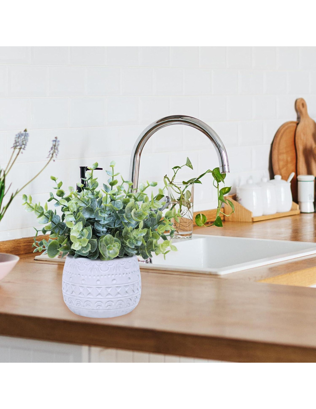 - La planta de eucalipto artificial en macetas de cerámica geométrica blanca puede decorar tu lugar durante todo el año. Pueden ser utilizadas como un hermoso centro de mesa y planta colgante. Perfectas para decorar una mesa de café, alféizar de ventana, mesa de comedor, mesa auxiliar, mostrador, estantería, repisa, baño, dormitorio, sala de estar, cocina, baño de visitas, jardín, salones, en cualquier lugar con luz solar mínima. Este conjunto de pequeña planta de eucalipto de imitación también hace un gran regalo para tus amigos y familiares.