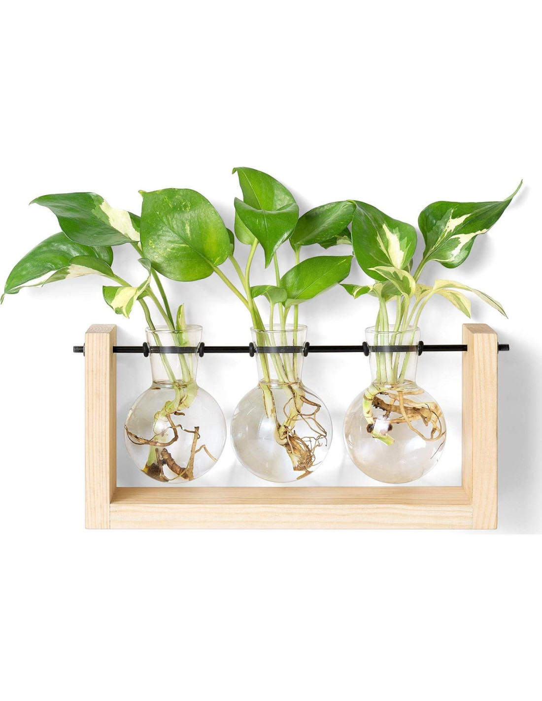 - Aspecto Minimalista: Diseño vintage de estante de madera en color retro natural combinado con 3 mini jarrones de vidrio en forma de bombilla. Una forma elegante de exhibir flores artificiales o frescas, esquejes de plantas, ramos mixtos y plantas enraizadas en agua, como Scindapsus, enredadera Pothos, violetas africanas, Bambú de la Suerte, incluso para hierbas.