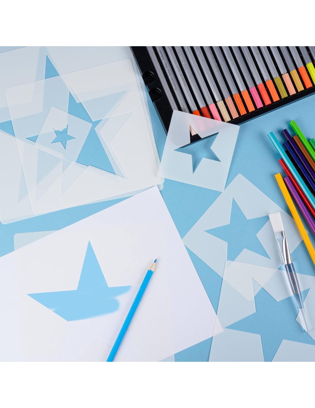 - Usos Versátiles: La plantilla de estrella de 5 puntos tiene una variedad de usos. Puede aplicarse a la mayoría de las superficies, incluyendo madera, papel, paredes, paneles de vidrio, pisos, rocas, muebles, prendas de punto y muchas más superficies y blankos. Y una variedad de opciones de tamaño te permite usar tu imaginación para crear de acuerdo a tus preferencias y necesidades.