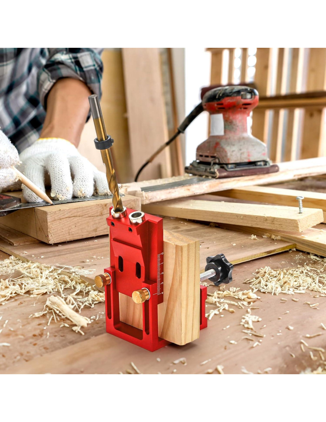 Incluye todo lo necesario para su uso inmediato: plantilla de agujero de pocket roja, 10 tapones de plástico, 10 tornillos de agujero de pocket, 1 llave, 1 broca de 9.5 mm con un anillo limitador, y una broca de 175 mm de longitud. Hecho de aleación de aluminio resistente y duradera, cuenta con escalas de doble cara (métrico + pulgadas) para ajustes precisos que se adaptan a cualquier requisito del proyecto. Ajusta la profundidad del taladro sin esfuerzo para materiales de diferentes grosores (1.5 mm a 40 mm).