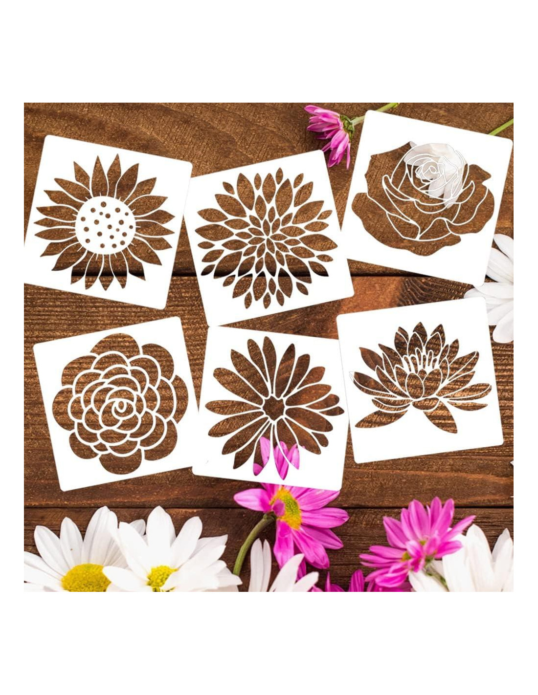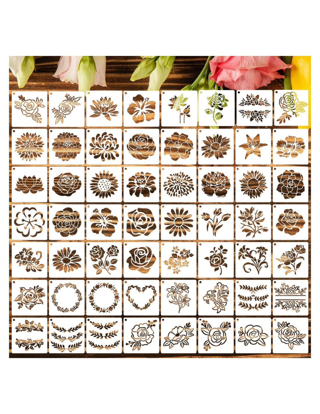 - Lo que obtienes: Una colección de 56 piezas de varias plantillas florales. Cada plantilla de flor para pintar en madera mide 3x3 pulgadas (7.62x7.62 cm).