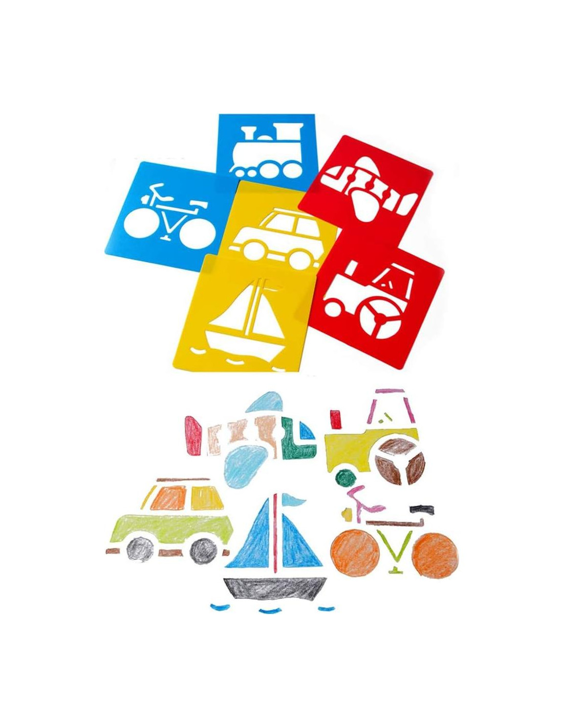 - Paquete de 36 piezas de plantillas, incluyendo 6 frutas, 6 vehículos, 6 animales de la jungla, 6 animales, 6 dinosaurios y 6 plantillas de animales marinos en colores aleatorios.