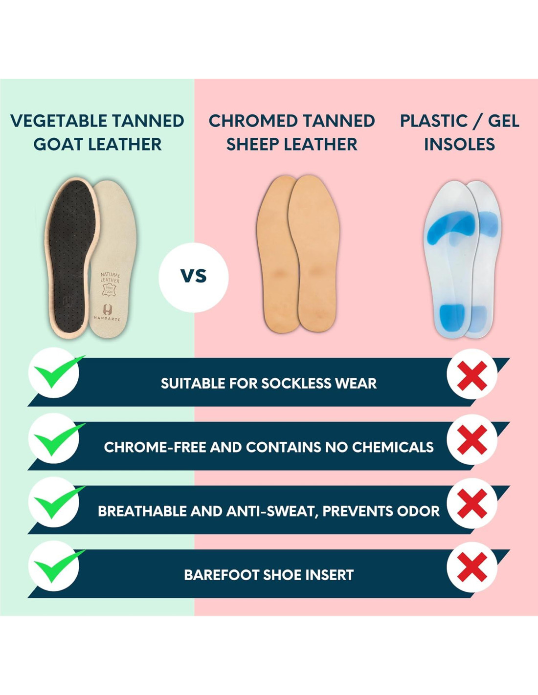 - AMORTIGUACIÓN DE CUERO PREMIUM - Nuestras plantillas de cuero para mujeres y hombres están hechas de 100% piel de cabra de grano completo curtida con vegetales. Estas plantillas ultra cómodas reducen la fatiga en los pies sin añadir volumen a sus zapatos.