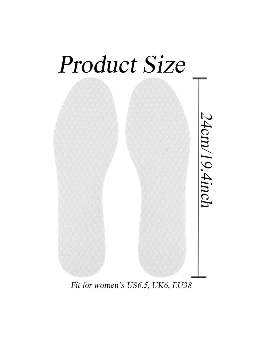 - Color: Blanco; - Material: Pulpa y fibra de papel; - Talla Mujeres: Aproximadamente 24cm de largo; - Talla Hombres: Aproximadamente 26cm de largo; Paquete Incluye: 10 Pares de cada pedido. - Las Plantillas Transpirables mantienen tus pies limpios y frescos todo el día. - Plantillas desechables ultraligeras y extremadamente delgadas; Almohadillas de longitud completa que confortan desde el talón hasta los dedos. - Fácil de recortar para ajustarse a tus pies; Plantillas suaves y finas hacen que andar descalzo sea cómodo y acogedor. - Material ecológico, transpirable y absorbente de sudor, prevención de olores, higiene y conveniencia. - El diseño de textura en relieve no solo es eficaz contra deslizamientos, sino que también masajea cómodamente las plantas de los pies. Por favor, no dudes en contactarnos si tienes alguna pregunta sobre nuestro producto, responderemos dentro de 24 horas.