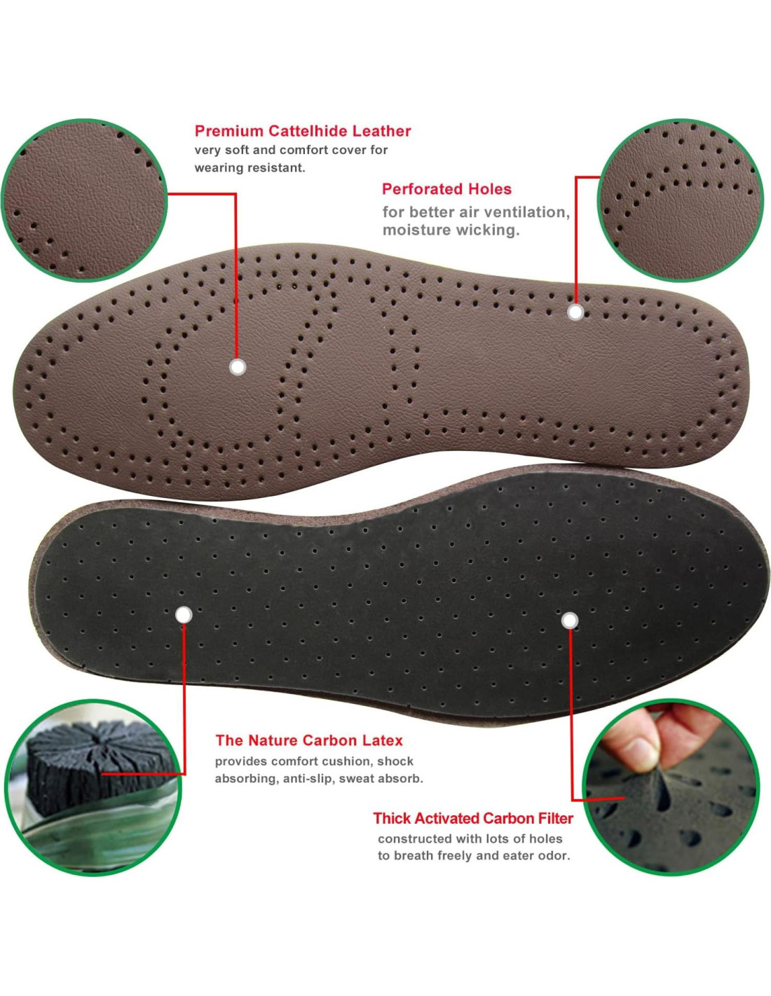 - Antideslizante y Eliminador de Olores - Las partes inferiores están hechas de látex de carbón activado ecológico, controlan y dispersan el olor de los pies, mejoran la fricción y son antideslizantes en los zapatos. El cuero transpirable superior puede absorber el sudor rápidamente durante largas caminatas y ejercicios, lo que mantiene tus pies siempre frescos y secos.