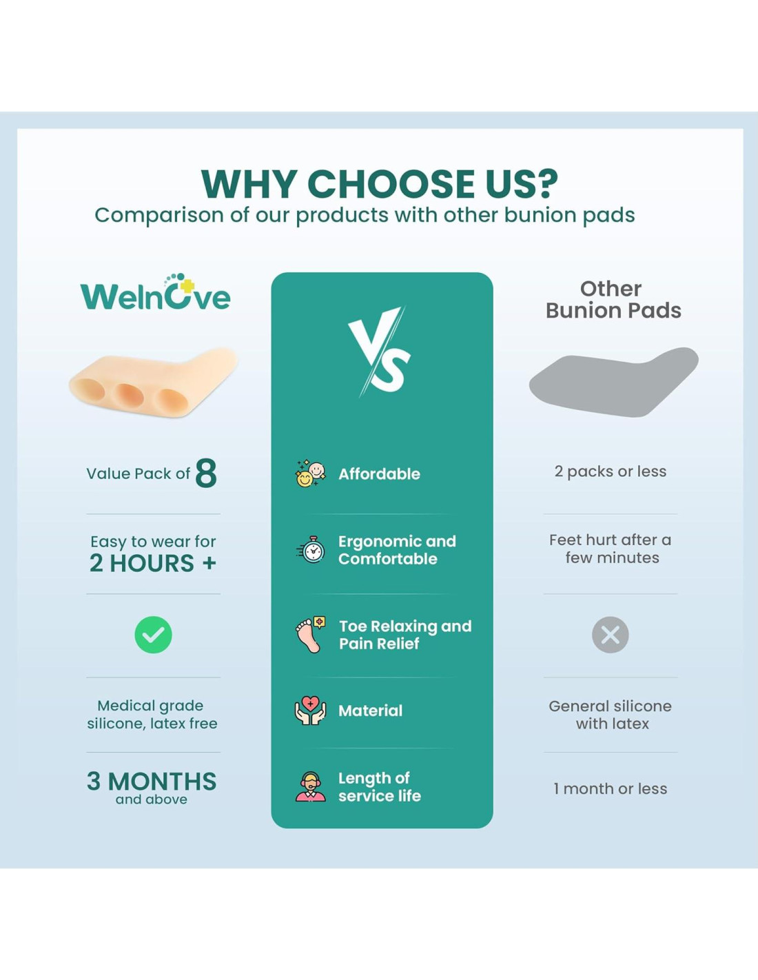 es una marca fundada por Sophia, quien vio la necesidad de productos de cuidado del pie efectivos y atractivos para aliviar el dolor y mejorar la calidad de vida. Sophia utilizó su experiencia personal y conocimiento para crear Welnove y proporcionar soluciones innovadoras para un óptimo. Con un equipo de profesionales, Welnove está dedicado a ayudar a las personas a lograr la mejor salud de sus pies. ¡Di adiós al dolor y hola a la comodidad durante tus actividades favoritas! Proporciona alivio del dolor y restauración siempre que sea necesario. Protege tus dedos todo el día. Los problemas de pies son fáciles de ignorar, pero tienen un impacto real en nuestras vidas. Los problemas podológicos a largo plazo no se prestan atención, y por lo tanto se pierde el período ideal de recuperación correctiva. Para cuando las personas se dan cuenta de que las condiciones del pie están afectando sus vidas, a menudo ya se han vuelto serias. Welnove es un fabricante especializado en el diseño y producción de productos para el cuidado de los pies. Welnove tiene como objetivo resolver los problemas de los pies de nuestros clientes, ayudando a reducir tus preocupaciones y hacer tu vida más cómoda.